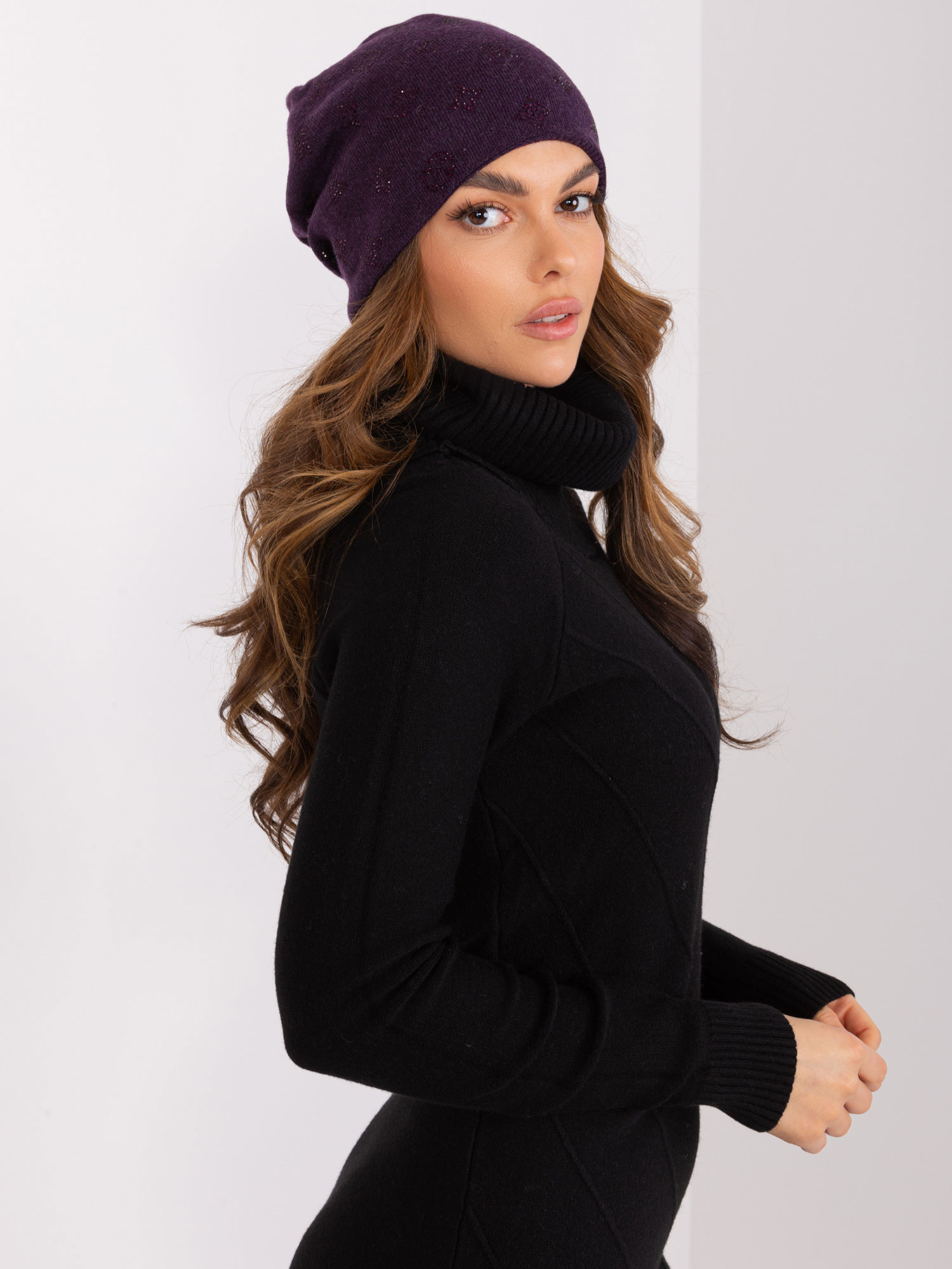 Ciemnofioletowa czapka z dzianiny.