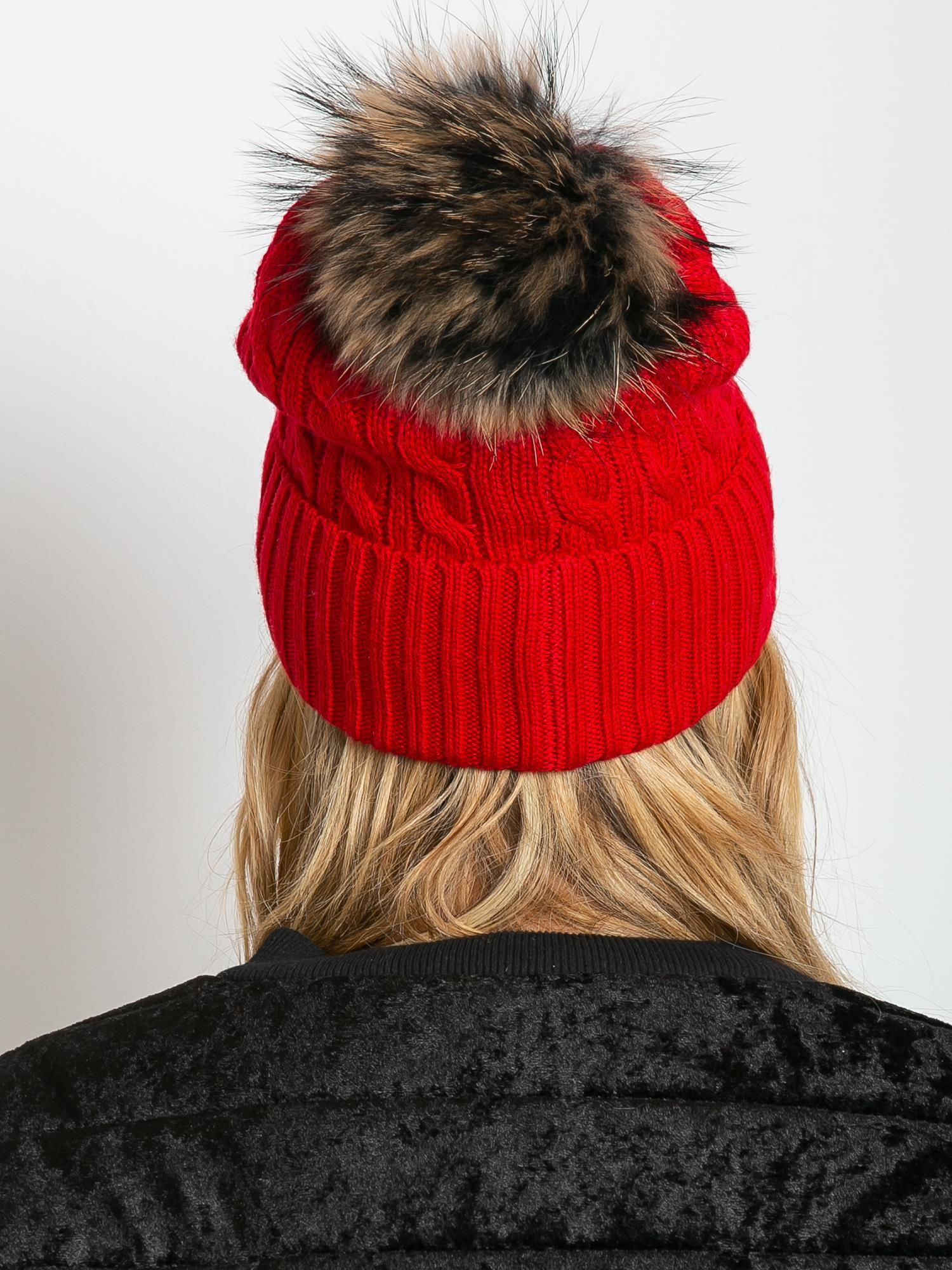 Czapka z warkoczowym splotem i futrzanym pomponem czerwona