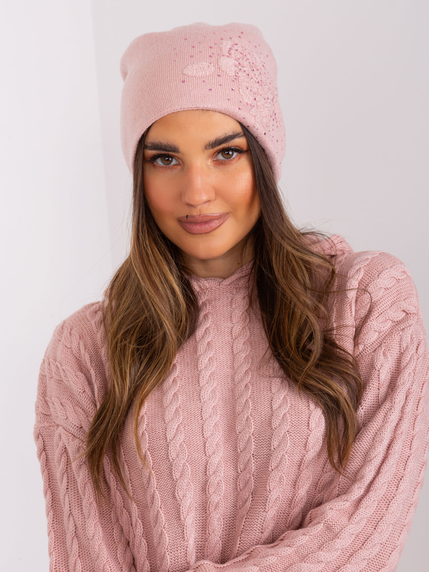 Jasnoróżowa czapka dzianinowa z dżetami.