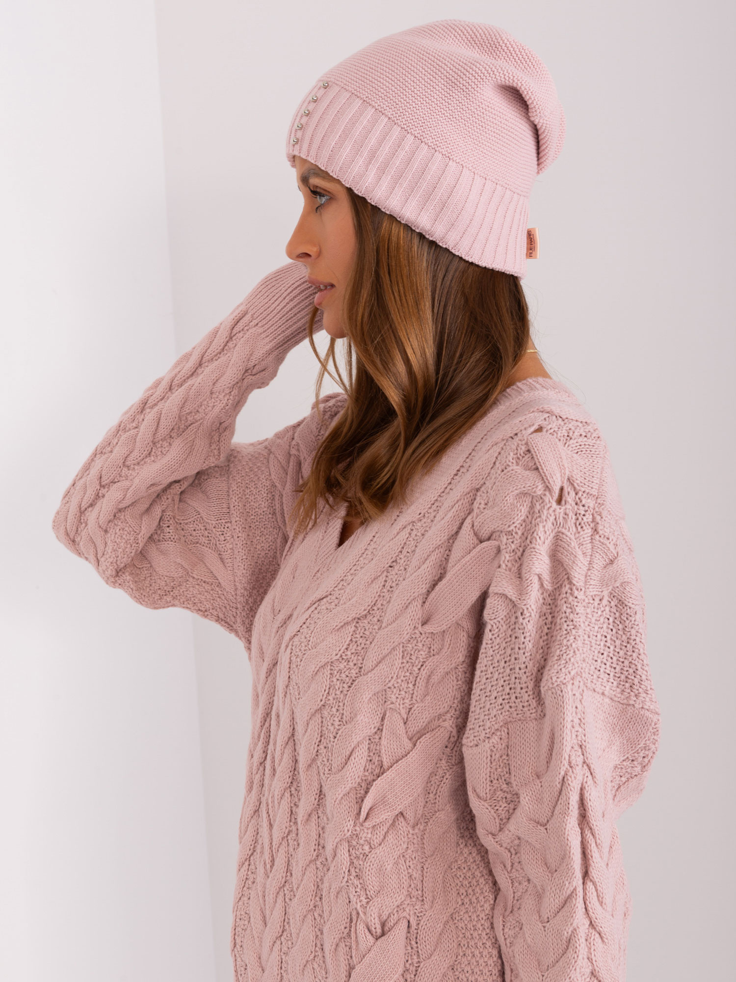 Jasnoróżowa czapka zimowa z aplikacją RUE PARIS .