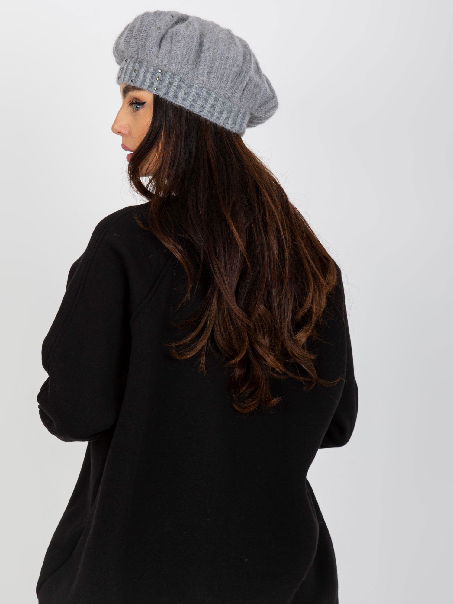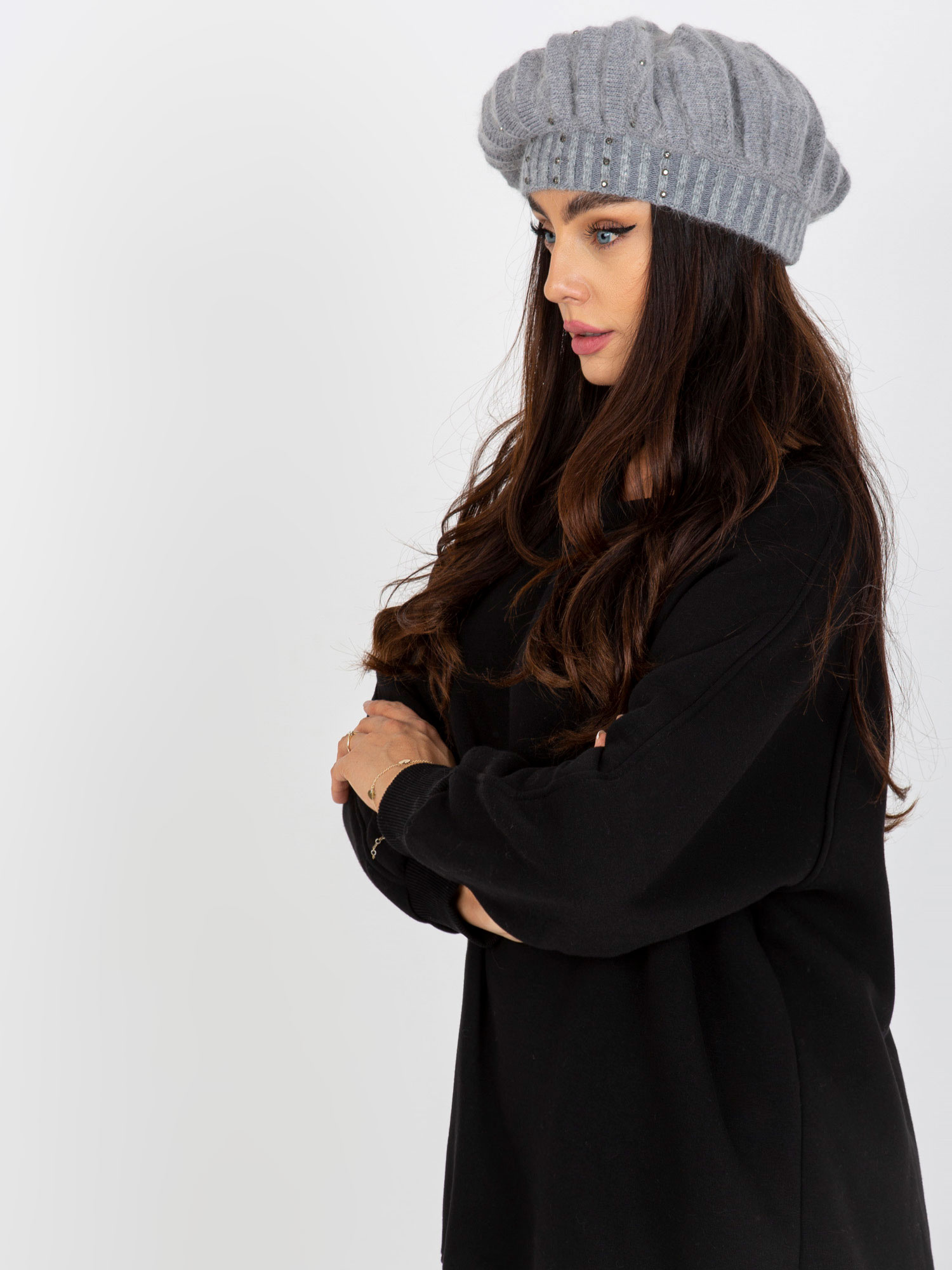 Szara damska czapka zimowa z dżetami .