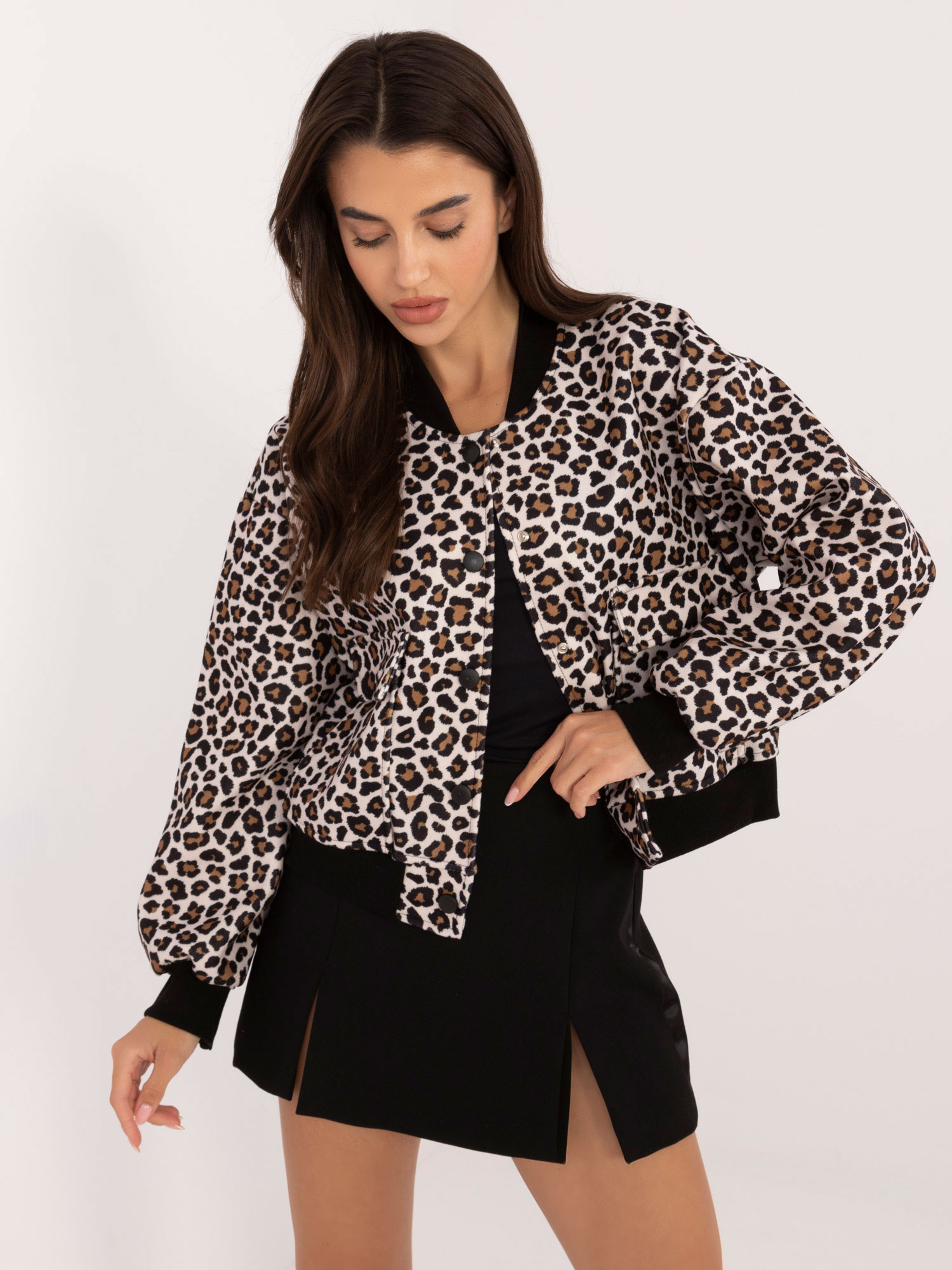 Modelka ma na sobie rozmiar S. Wymiary modelki: wzrost 174 cm, biust 92 cm, talia 62 cm, biodra 90 cm.