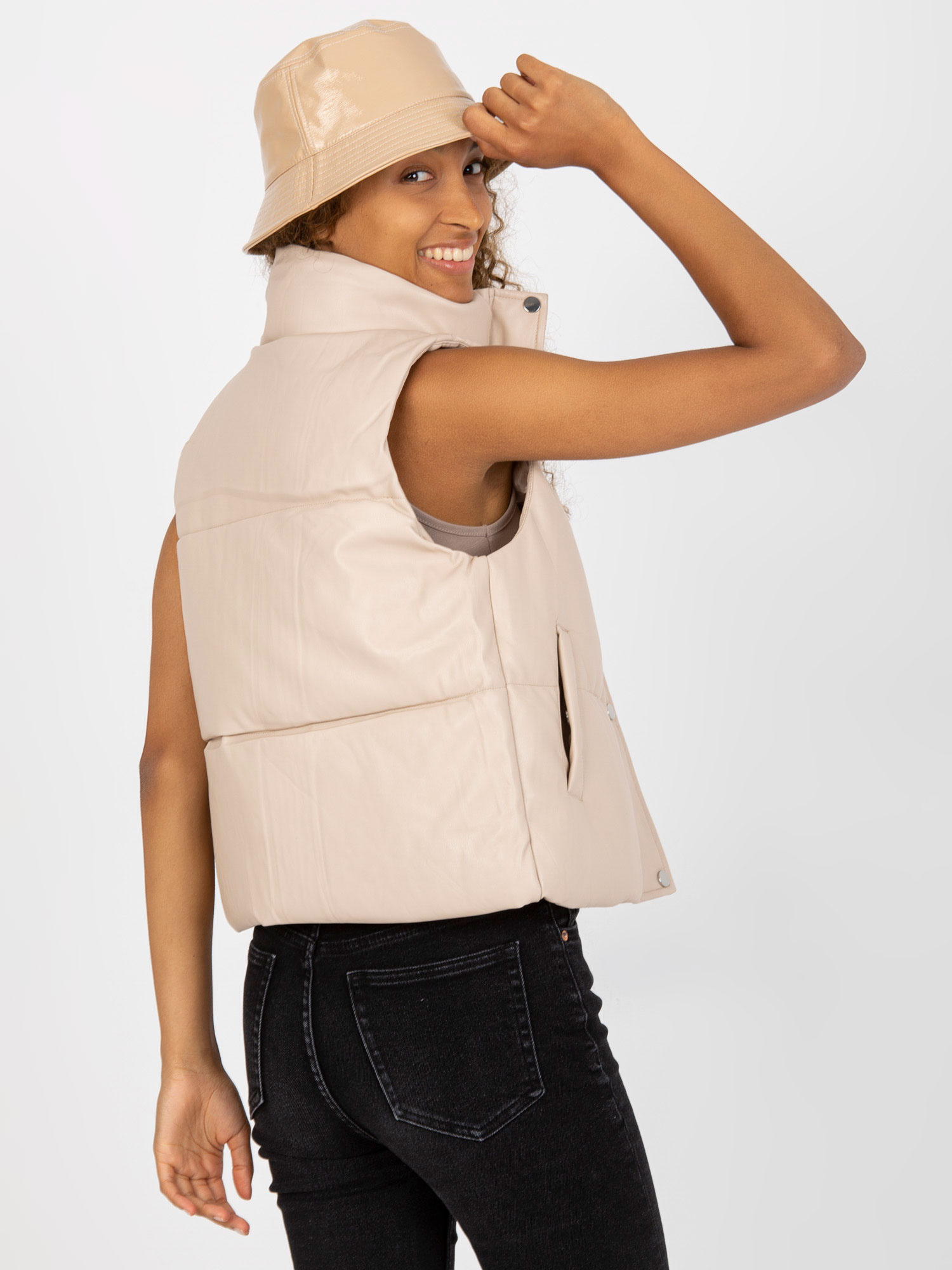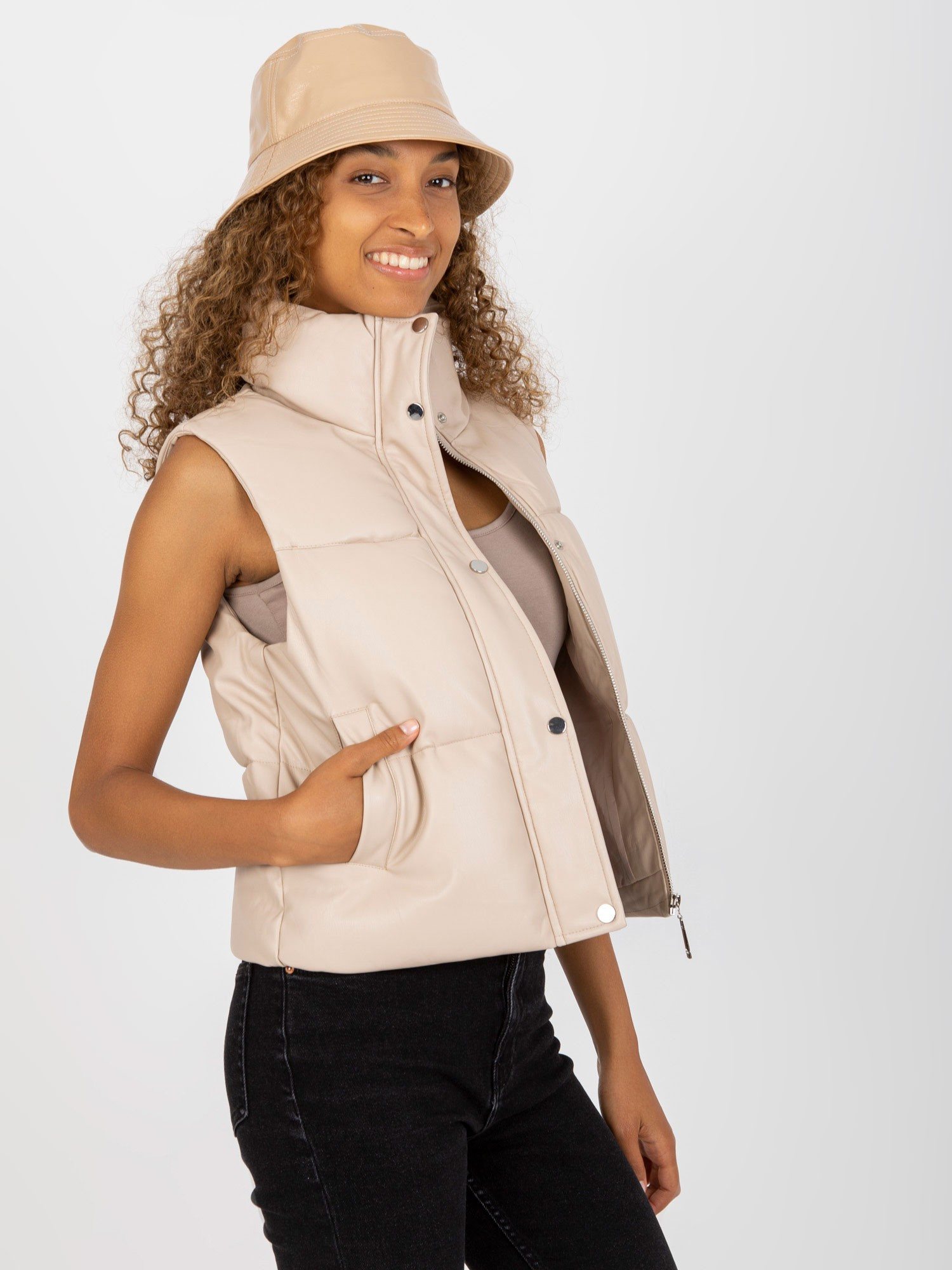Jasnobeżowa pikowana kamizelka z eko skóry .