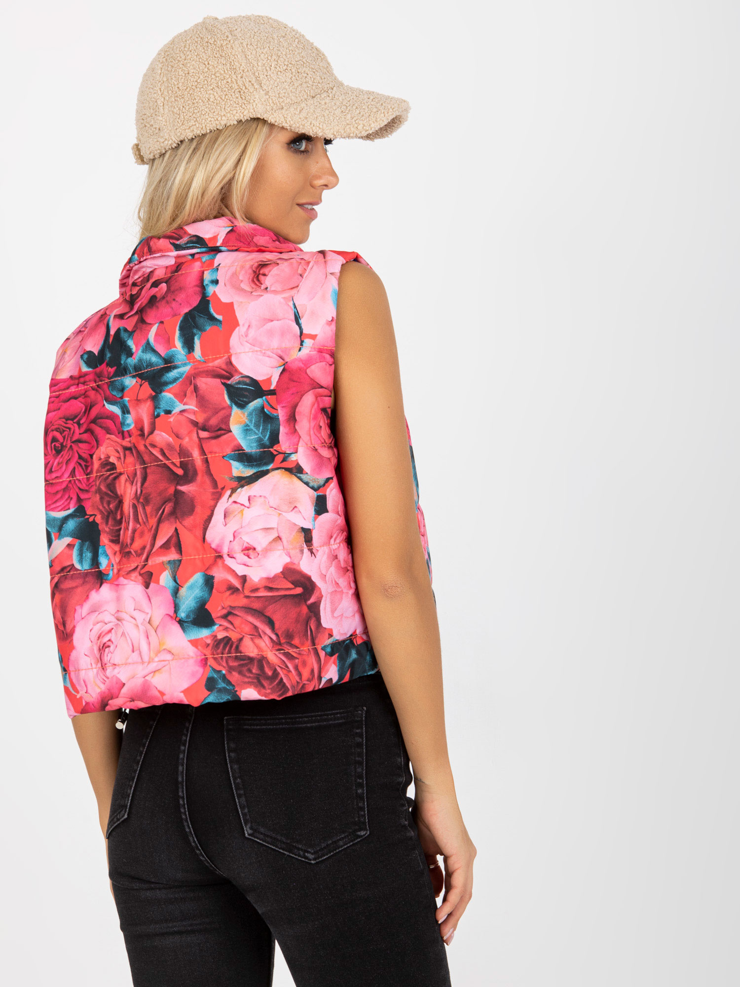 Różowa krótka kamizelka w kwiaty z kieszeniami .