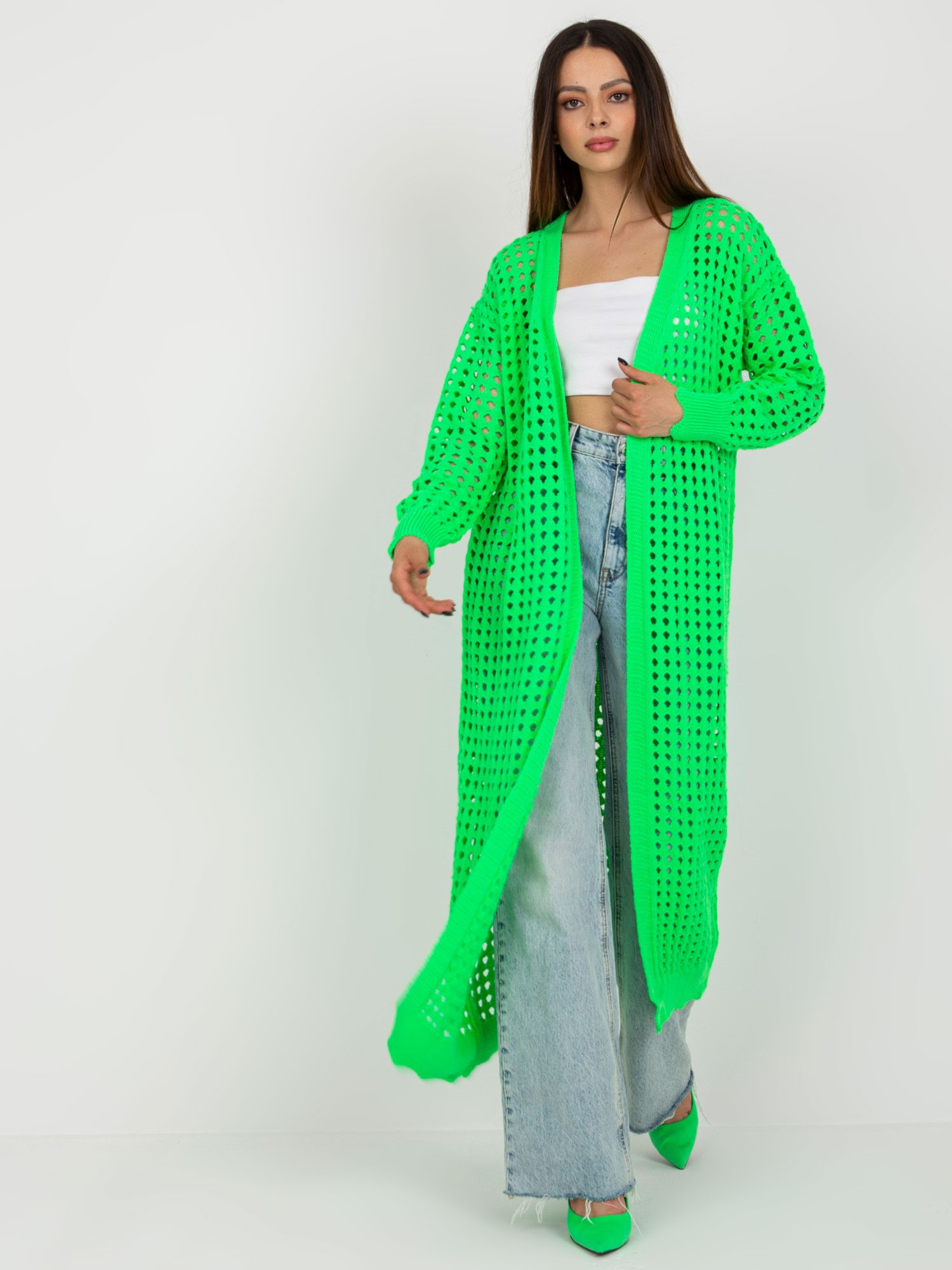 Fluo zielony długi kardigan w ażurowy wzór