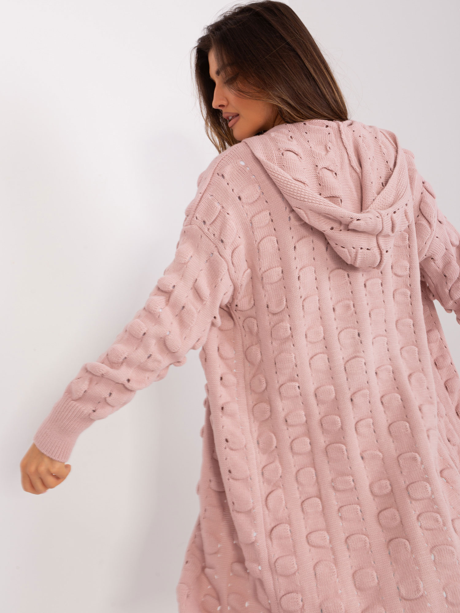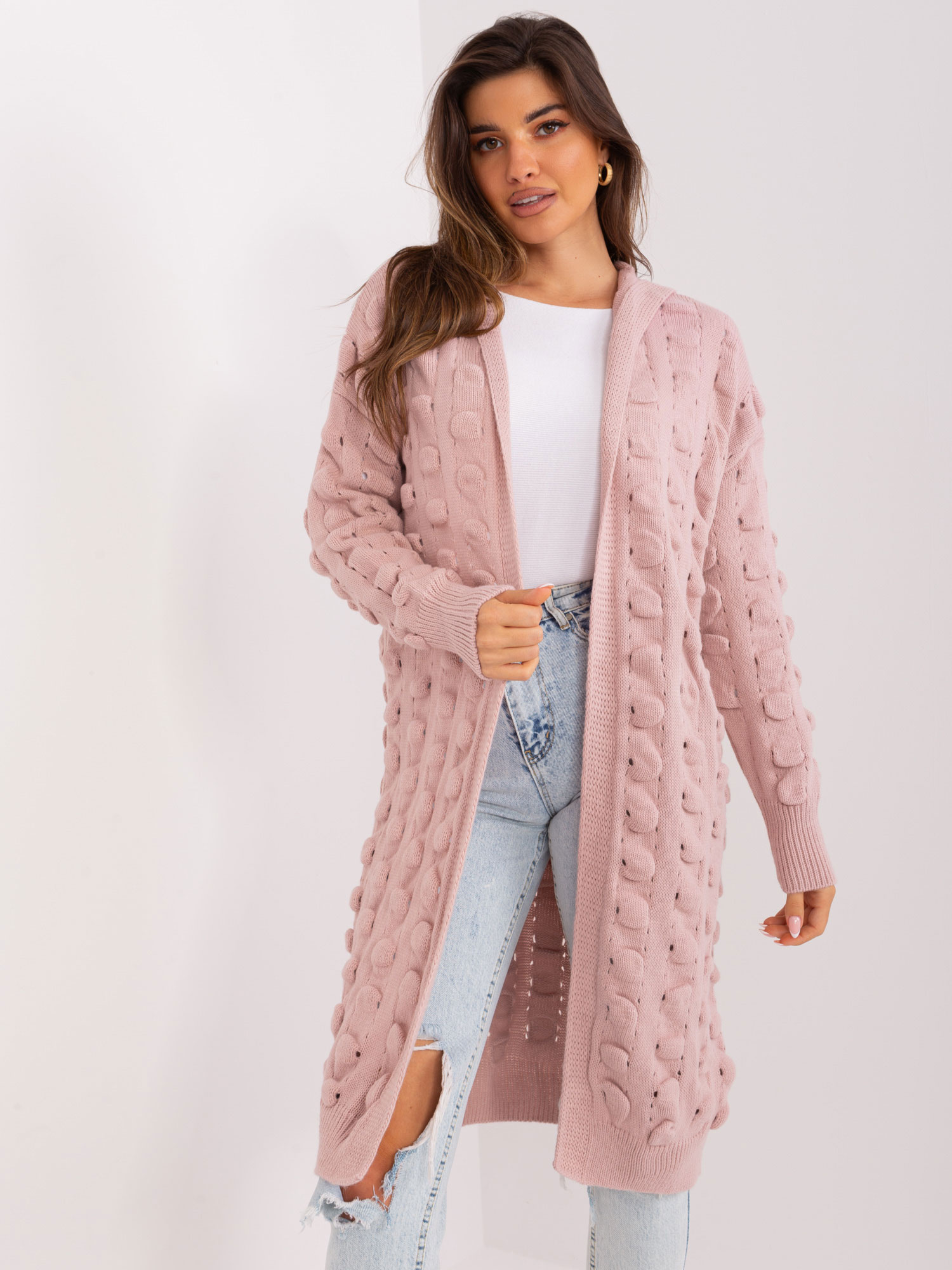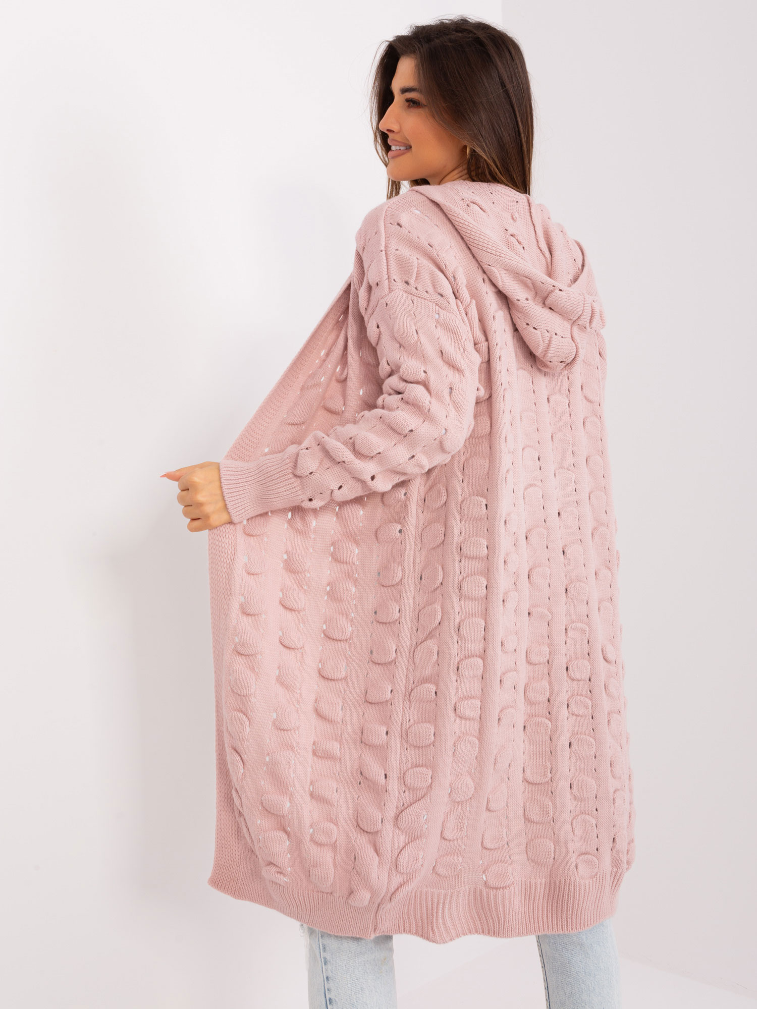 Wymiary kardiganu w rozmiarze one size mierzone na płasko: szerokość pod pachami – 70 cm, długość rękawa – 60 cm, długość całkowita – 107 cm