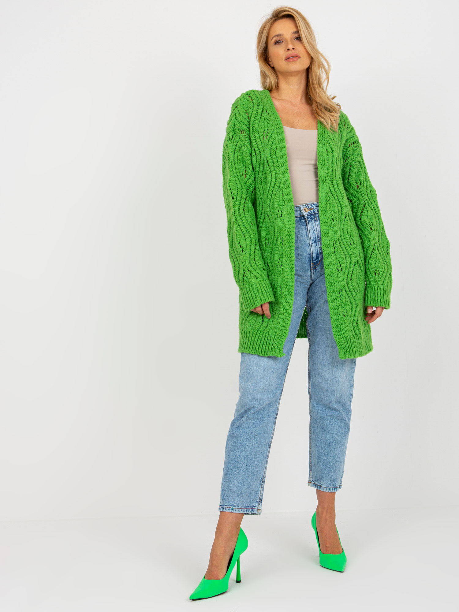 Jasnozielony damski ażurowy kardigan z dodatkiem wełny .