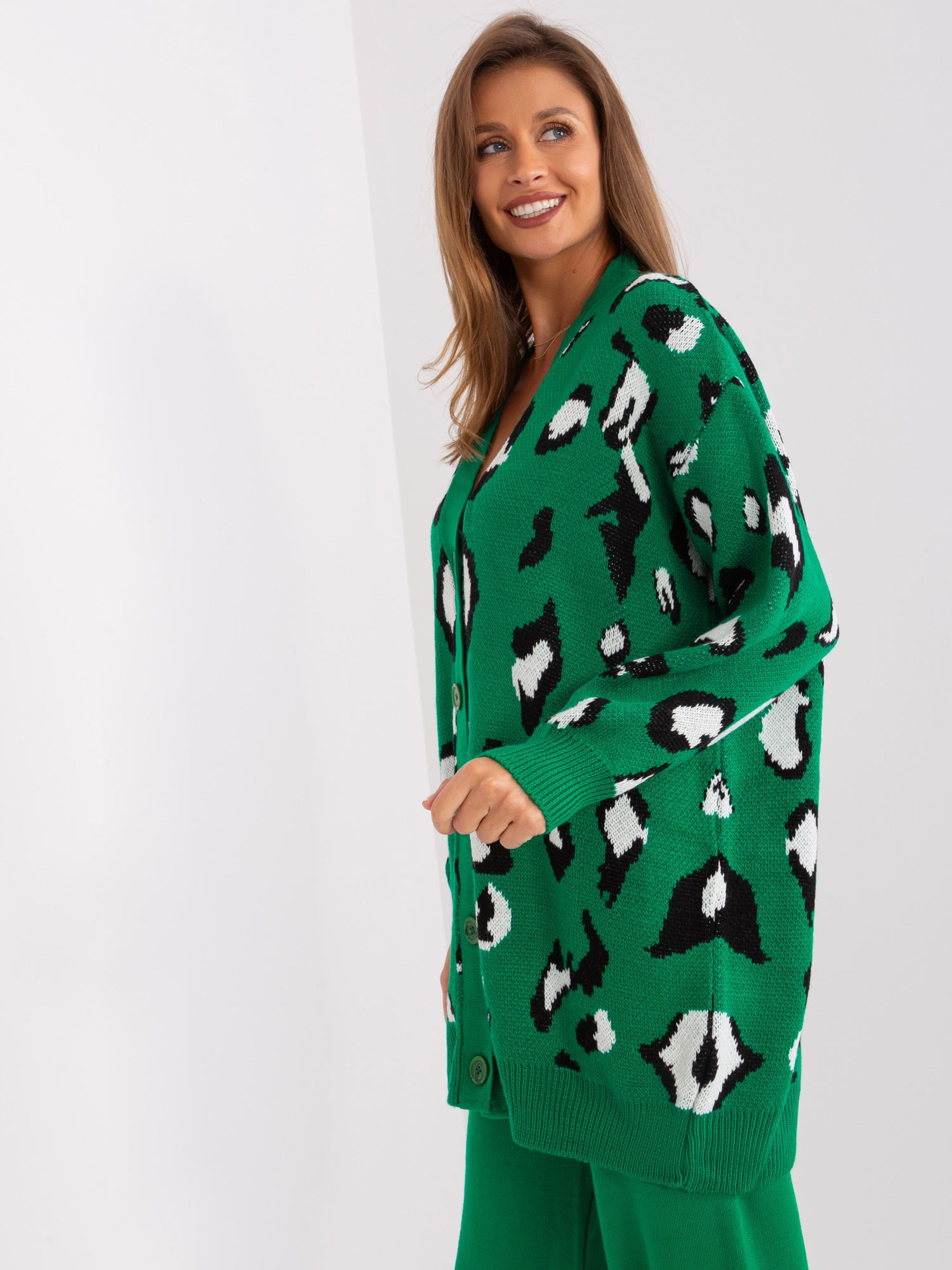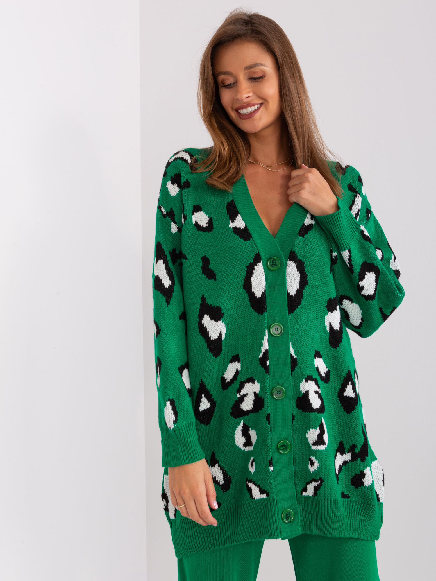 Zielony luźny kardigan w zwierzęcy wzór .