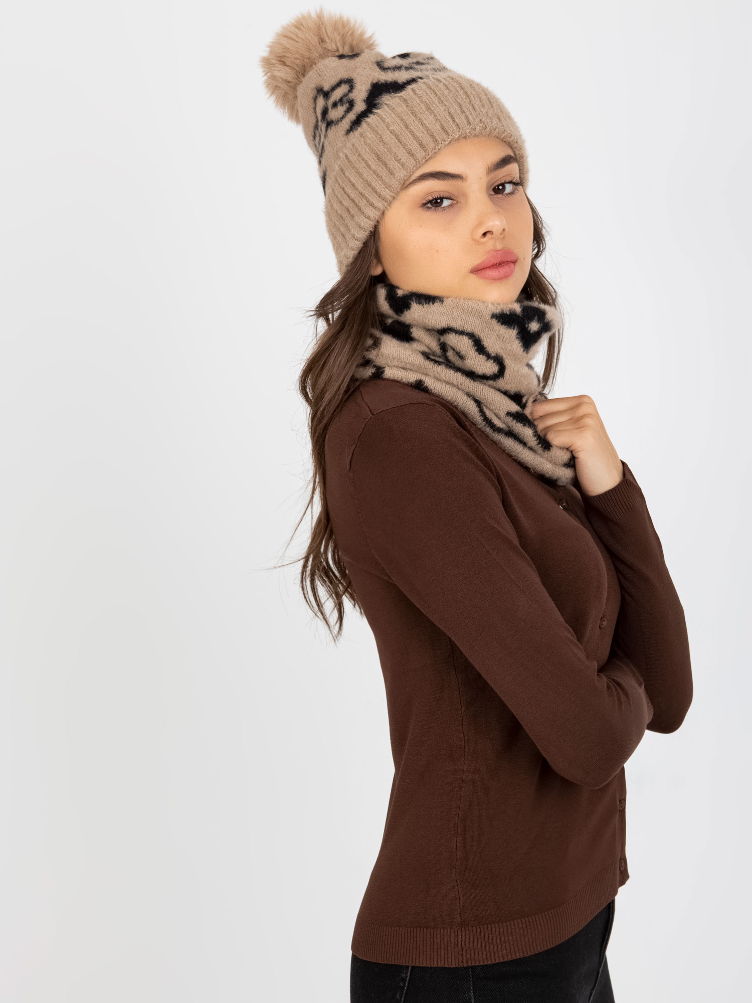 Beżowo-czarny ciepły komin damski .