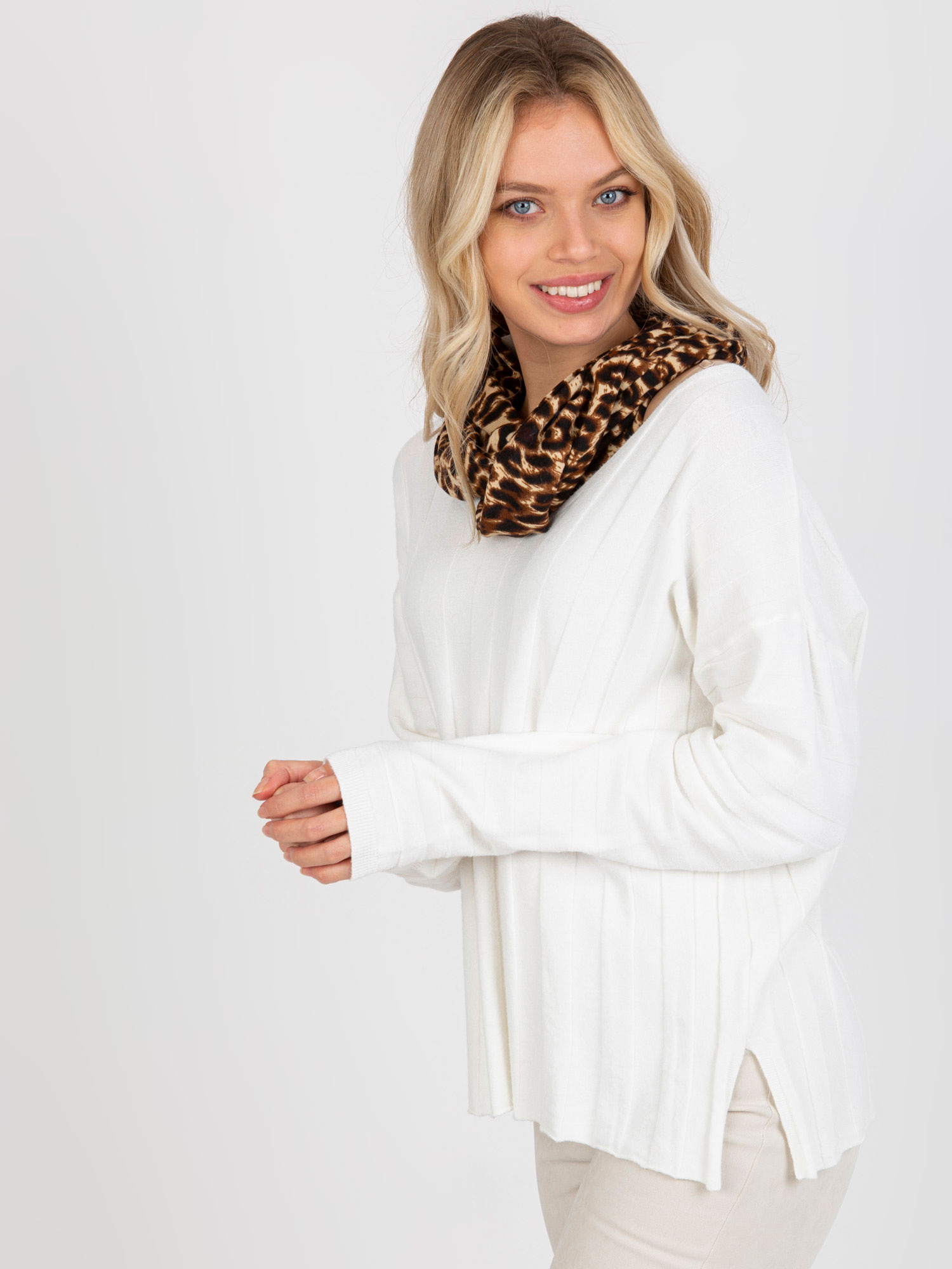Ciemnobeżowy komin damski w zwierzęcy wzór .