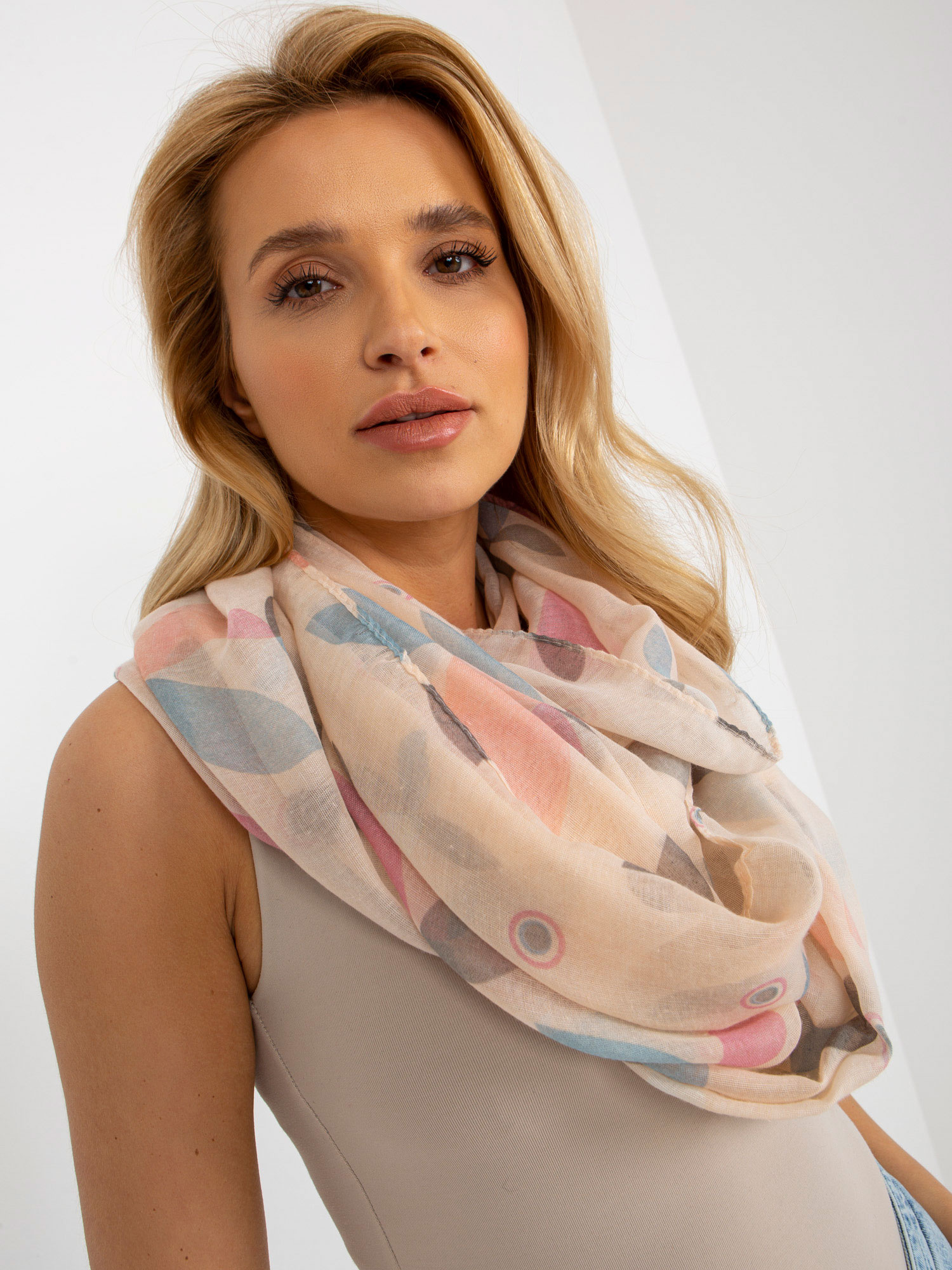 Jasnoróżowy wiskozowy komin z nadrukiem .