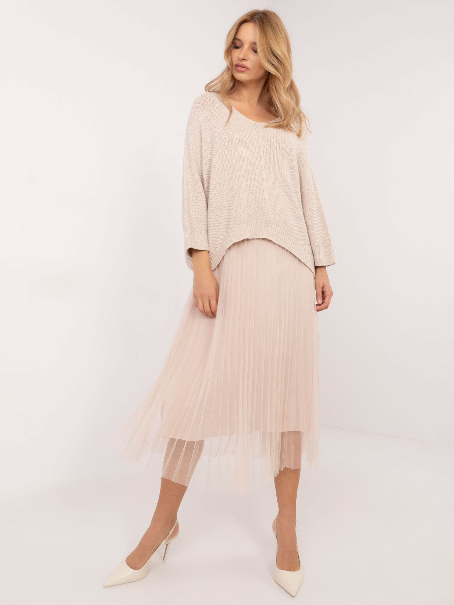 Wymiary kompletu w rozmiarze one size mierzone na płasko: szerokość swetra pod pachami – 62 cm, długość swetra – 55 cm, długość rękawa – 50 cm, szerokość sukienki pod pachami – 44 cm, długość sukienki – 124 cm.