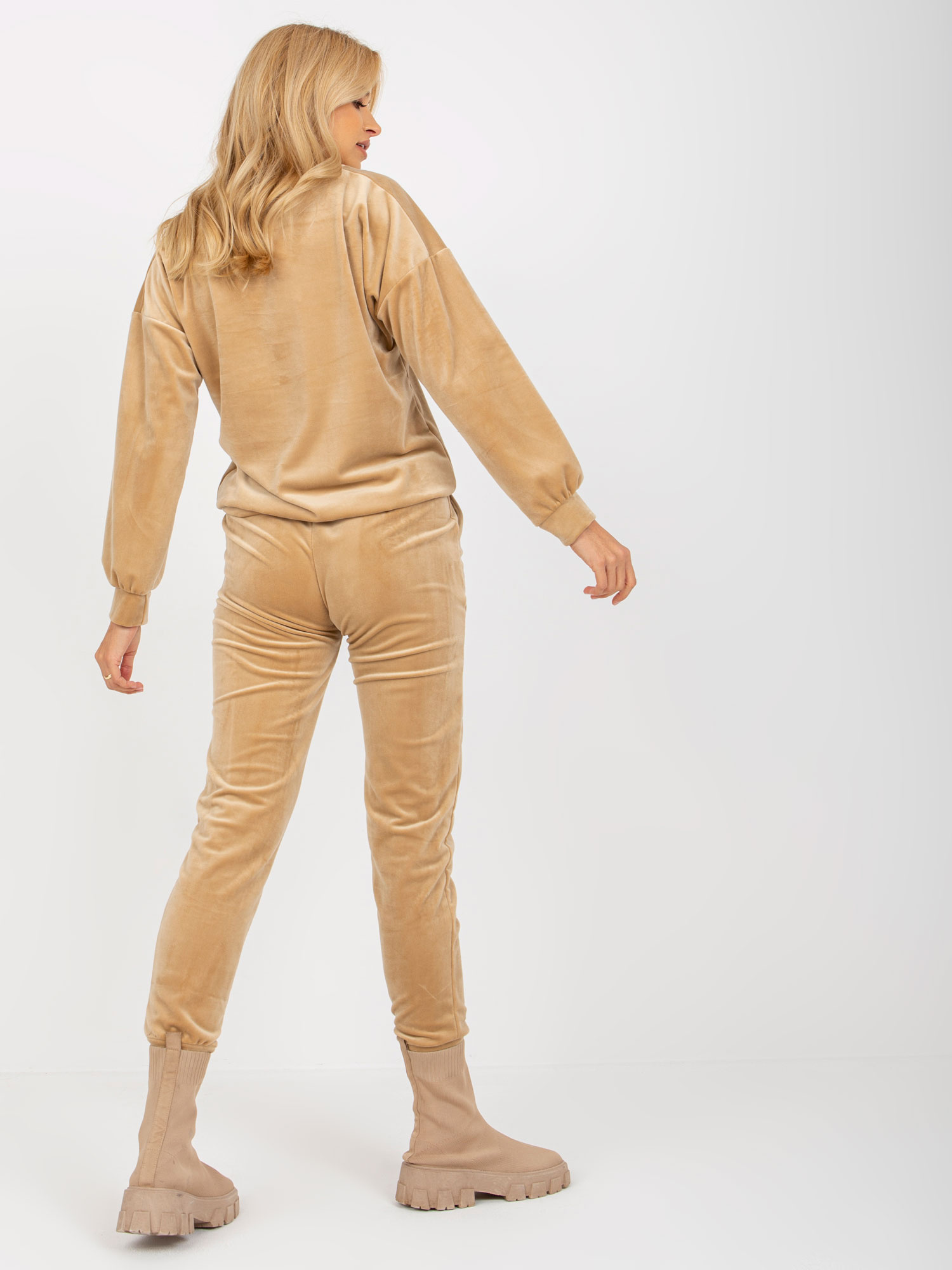 Beżowy gładki komplet welurowy z dekoltem V RUE PARIS.