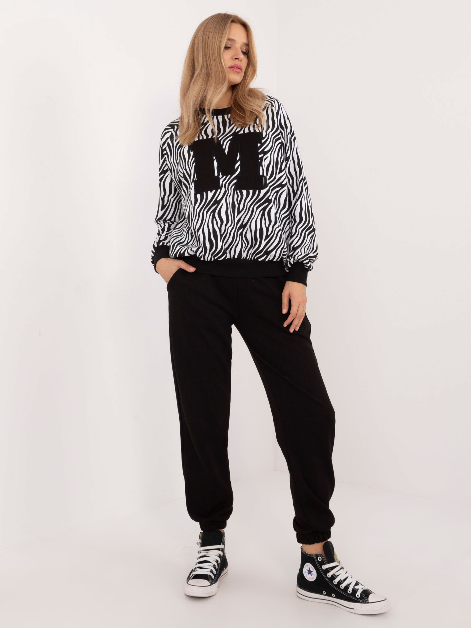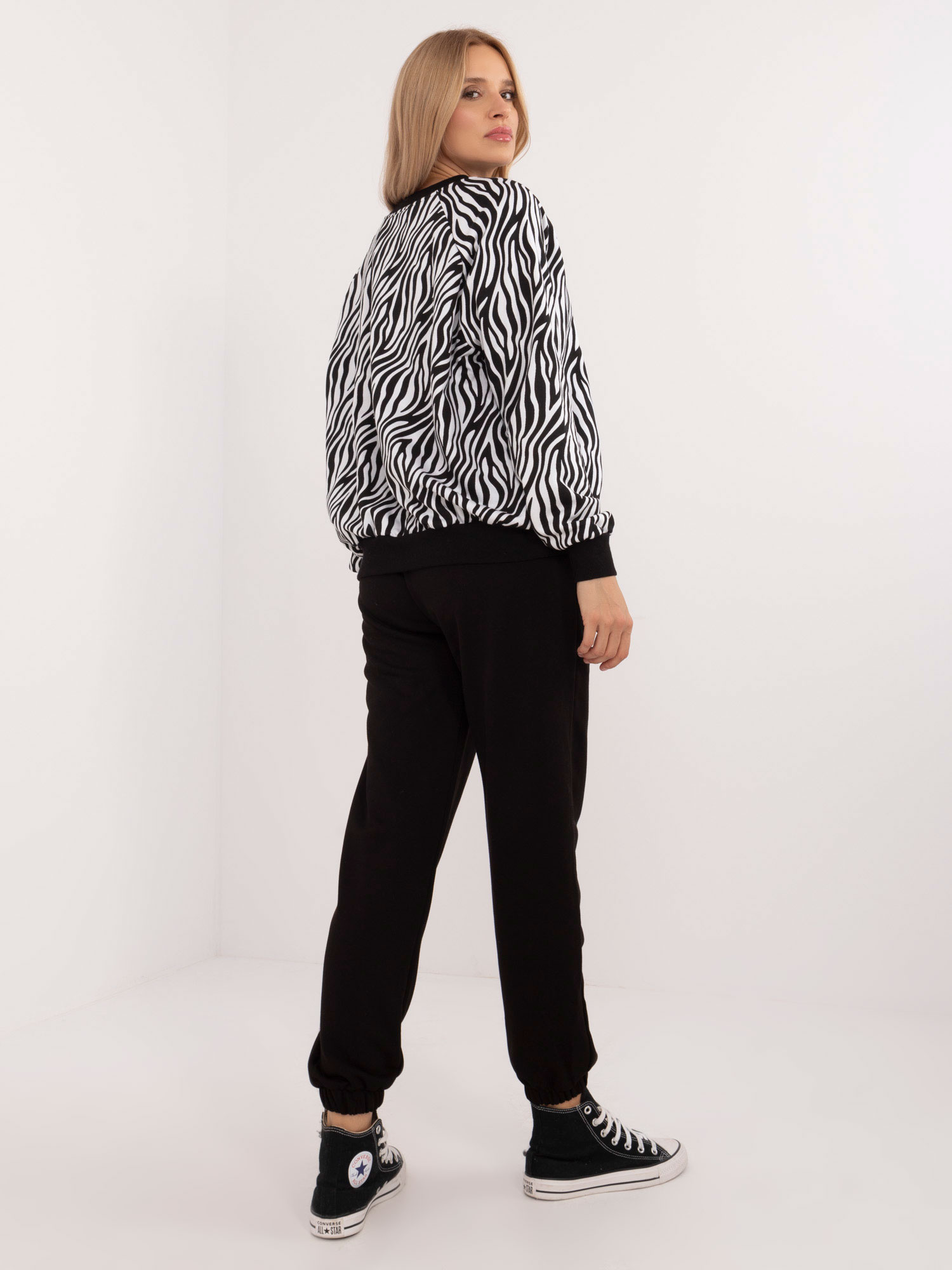 Wymiary kompletu w rozmiarze one size mierzone na płasko: szerokość pod pachami – 68 cm, długość bluzy – 64 cm, długość rękawa – 67 cm, szerokość spodni w pasie – 30 cm, długość spodni – 94 cm .