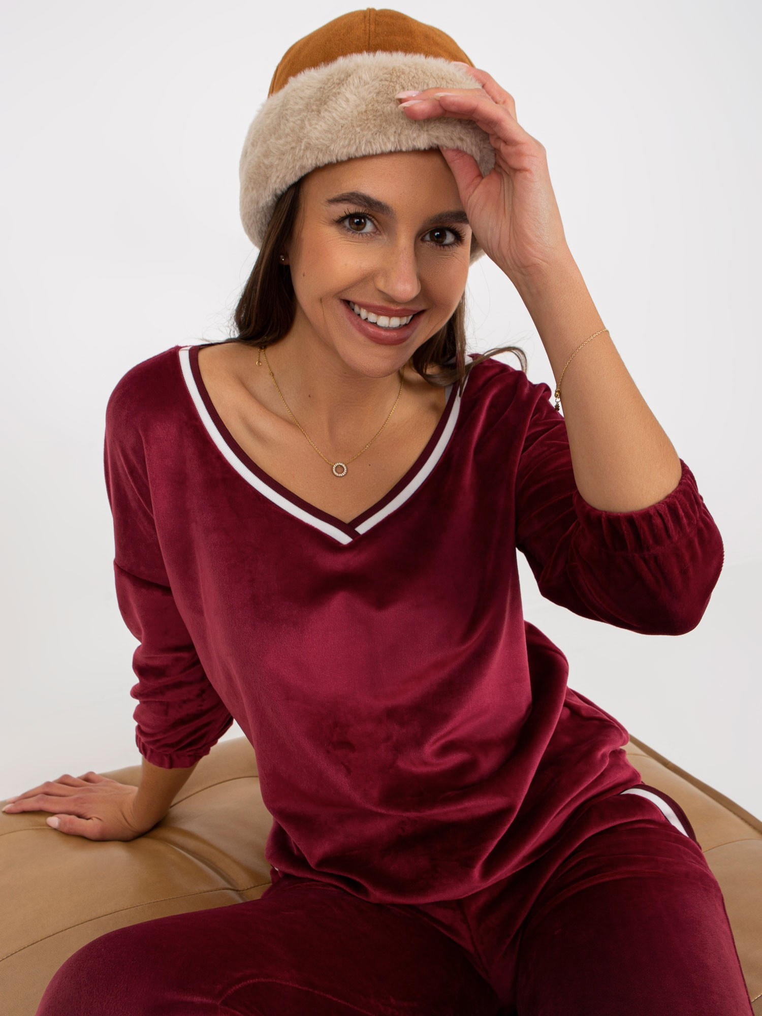 Bordowy dwuczęściowy komplet welurowy z rękawem 3/4 .