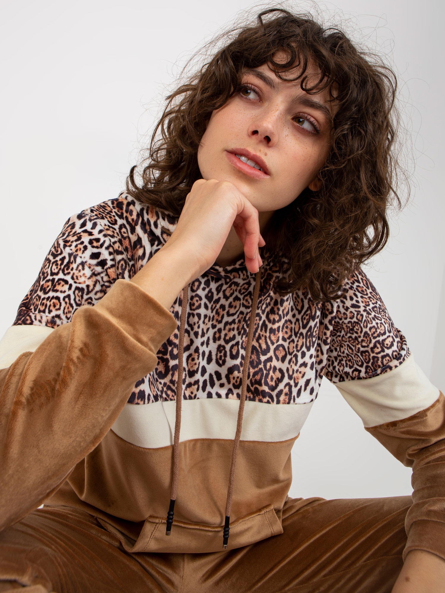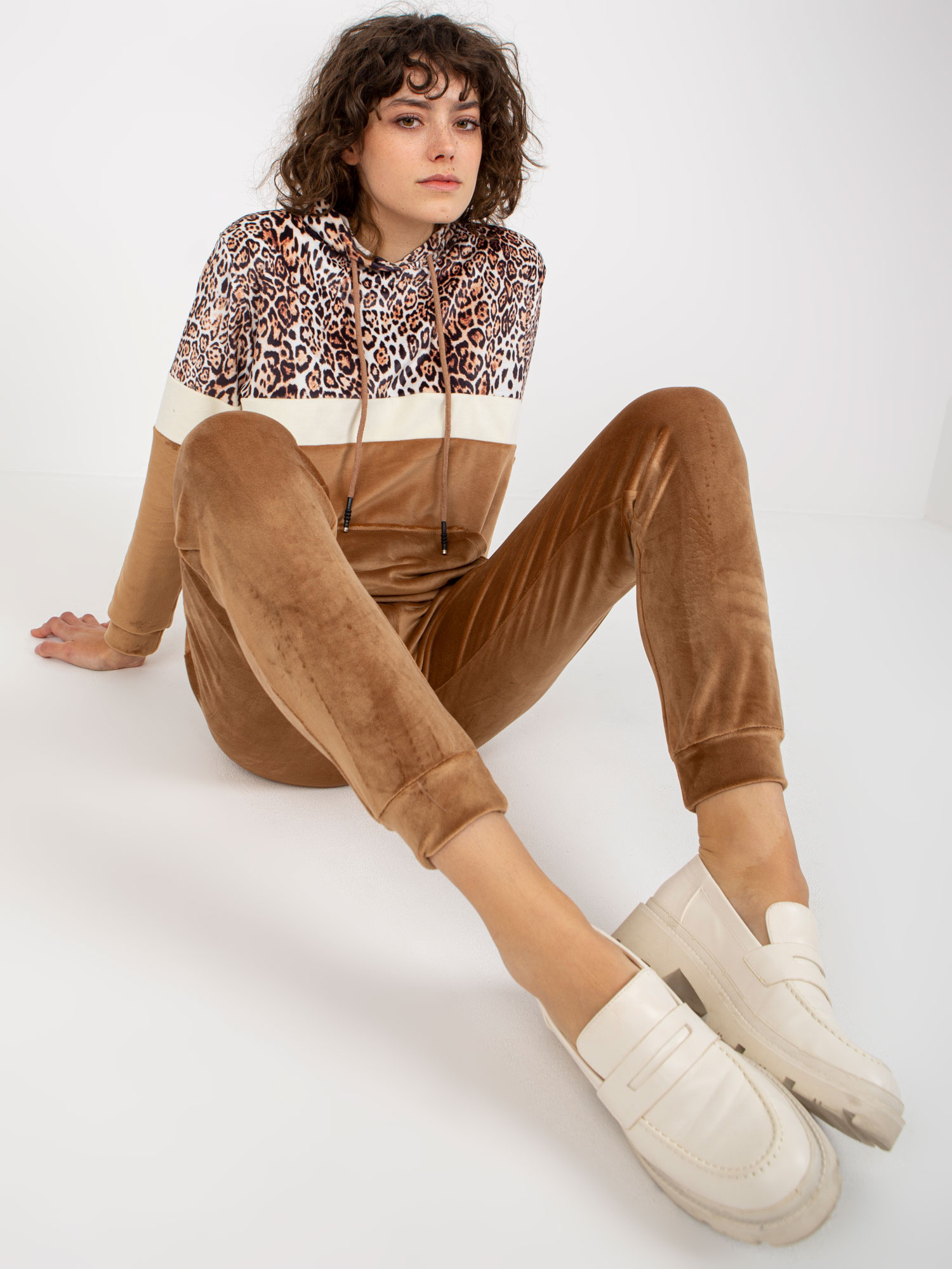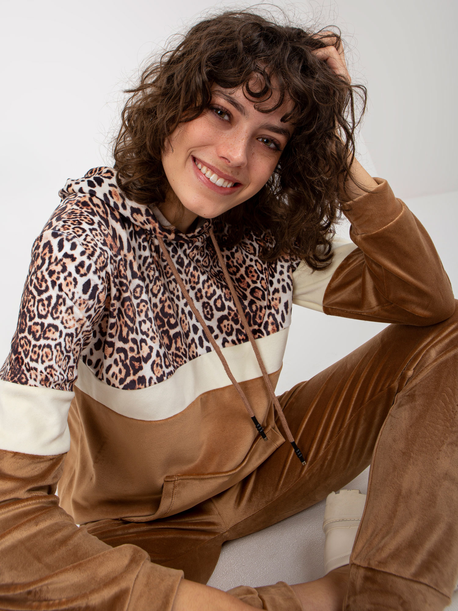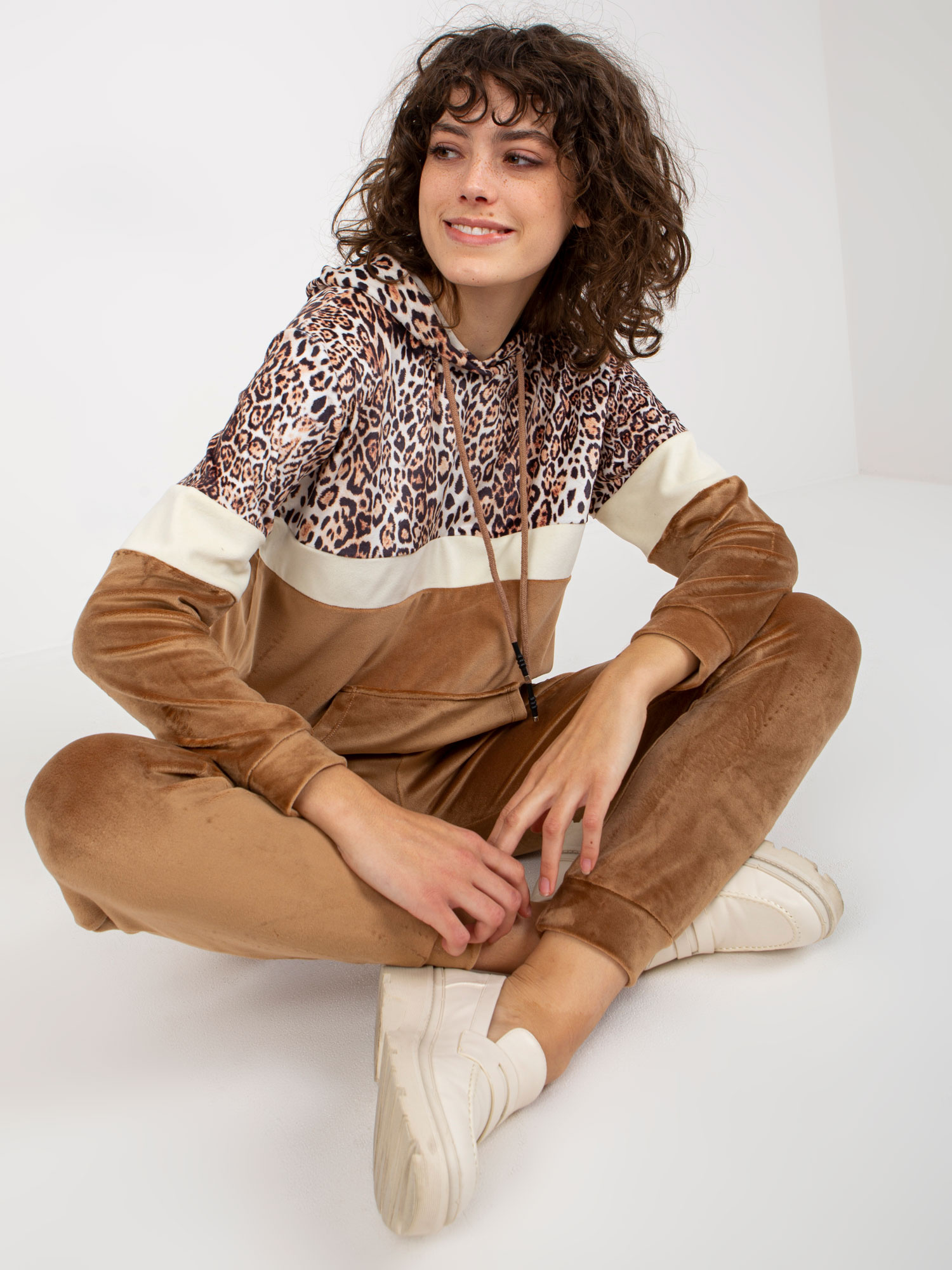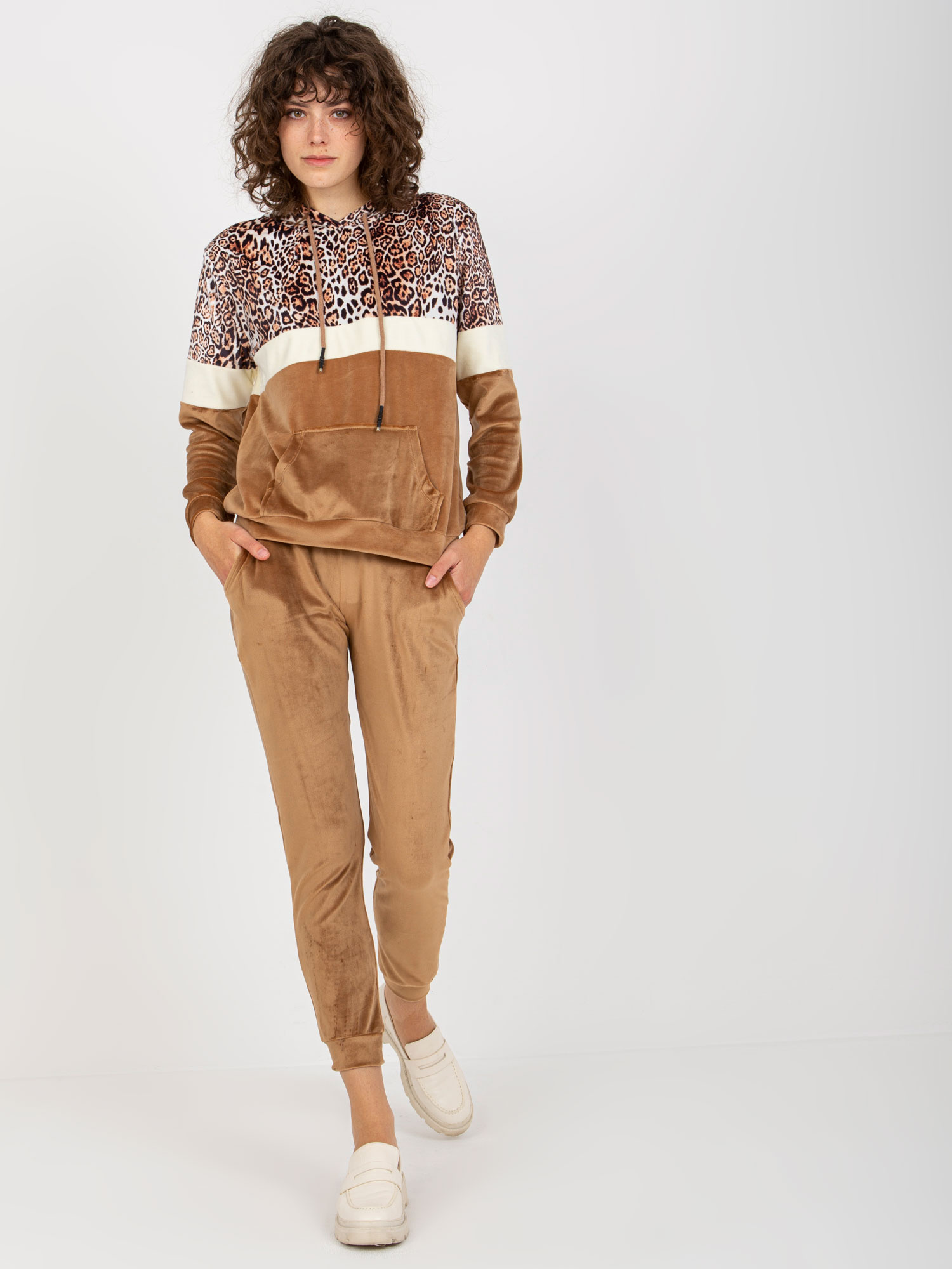 Beżowo-camelowy komplet welurowy z bluzą kangurką .