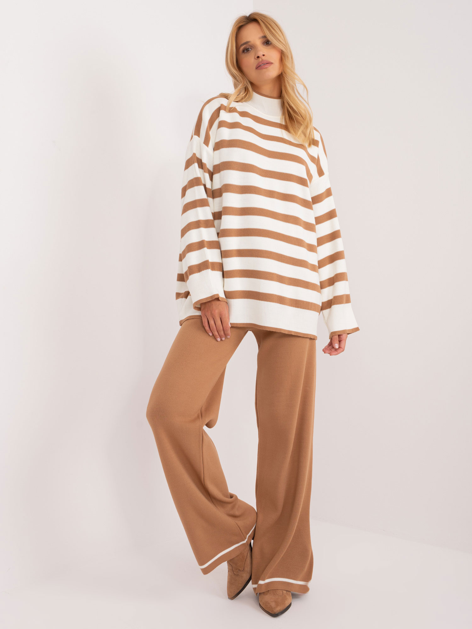 Wymiary kompletu w rozmiarze one size mierzone na płasko: szerokość swetra pod pachami – 63 cm, długość rękawa – 61 cm, długość swetra – 67 cm, szerokość spodni w pasie – 37 cm, wysokość stanu – 37 cm, długość spodni – 114 cm