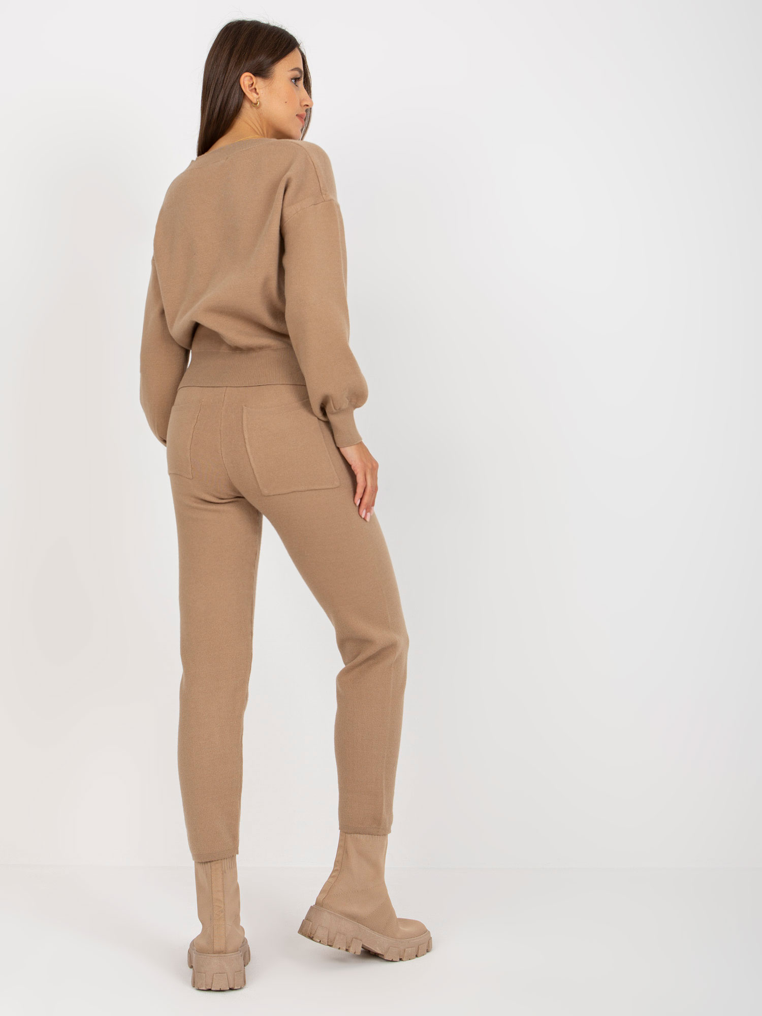 Ciemnobeżowy dwuczęściowy damski komplet casualowy.