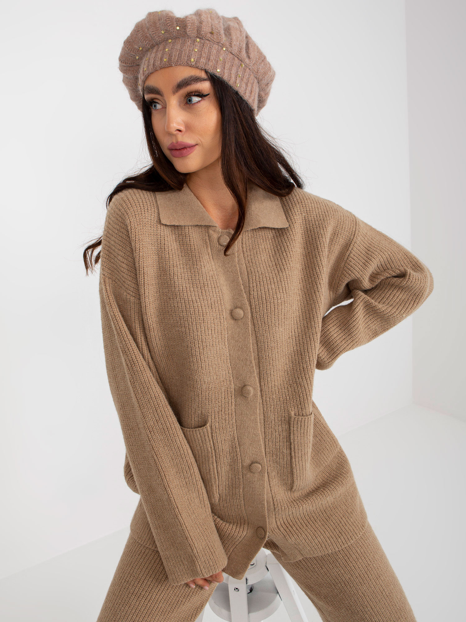 Ciemnobeżowy dzianinowy komplet casualowy ze swetrem .