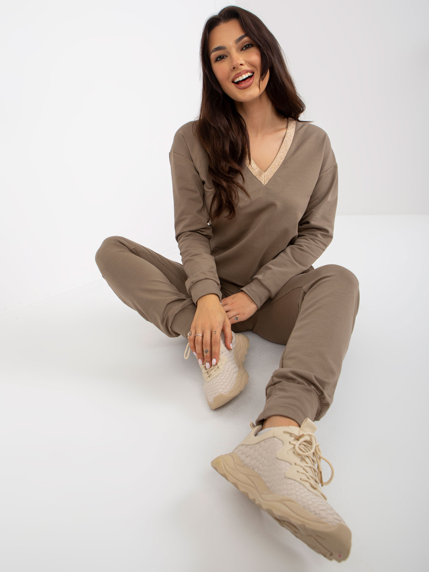 Ciemnobeżowy damski komplet casualowy z dekoltem V .