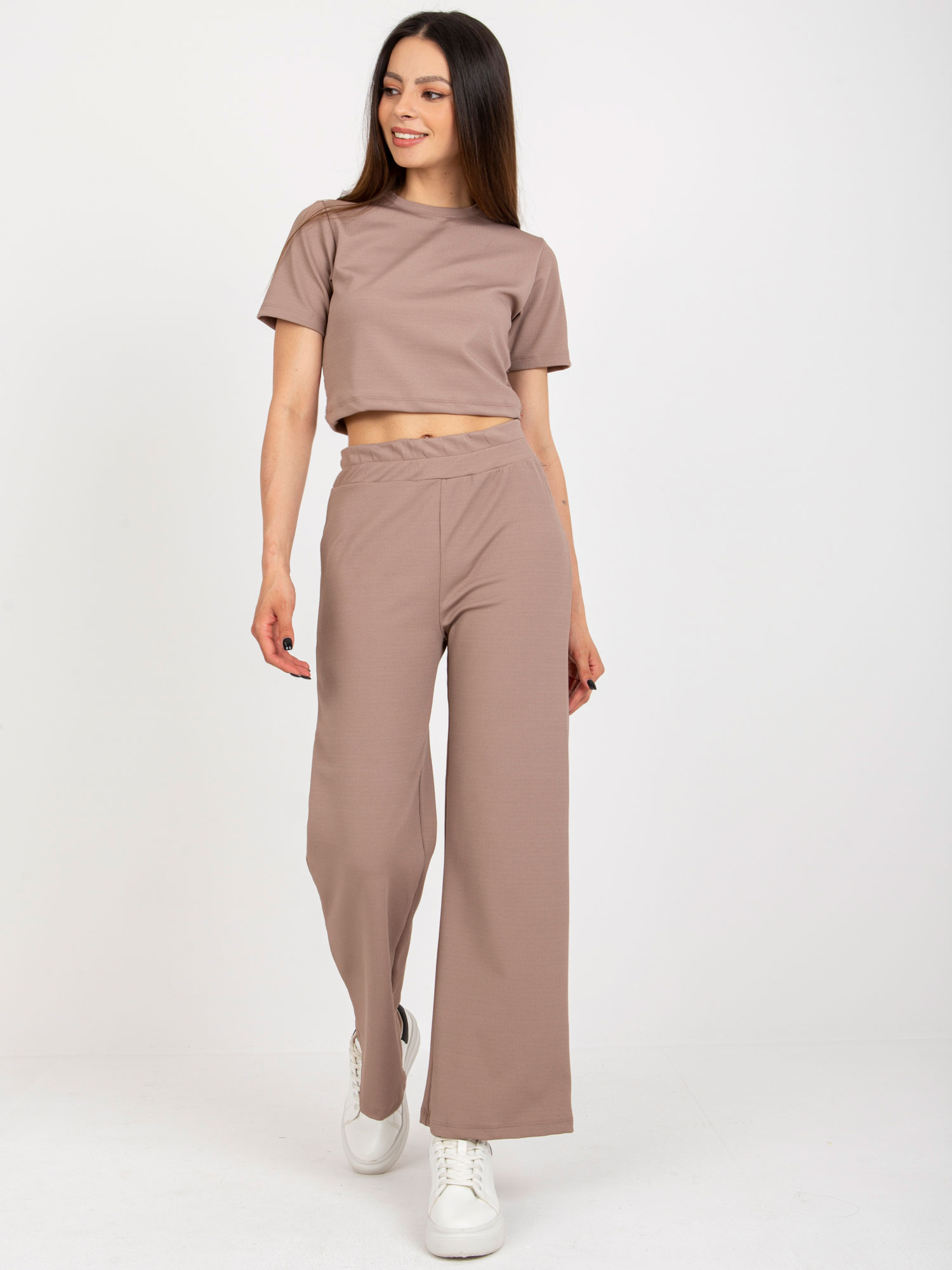 Ciemnobeżowy damski komplet casualowy w prążek