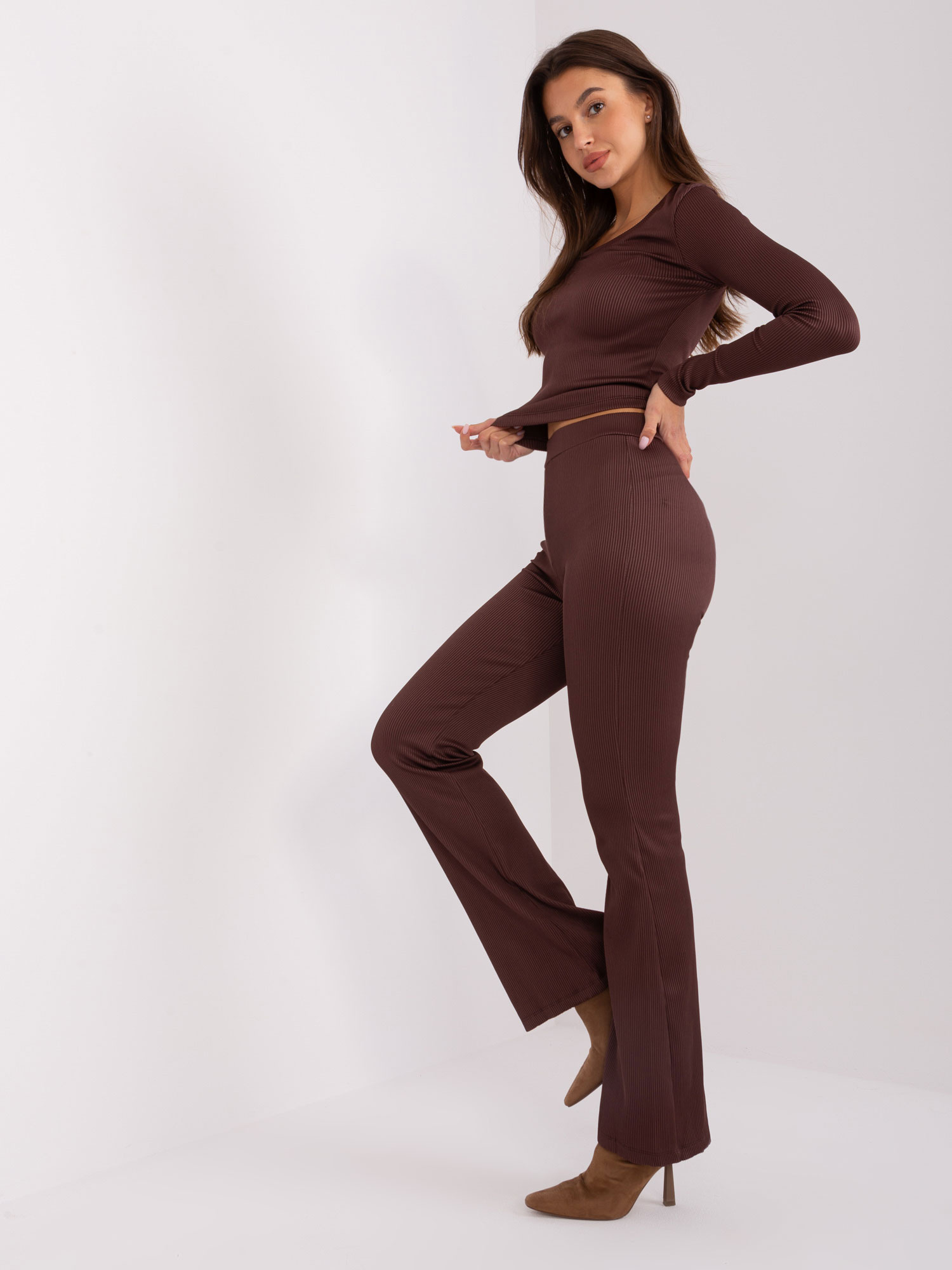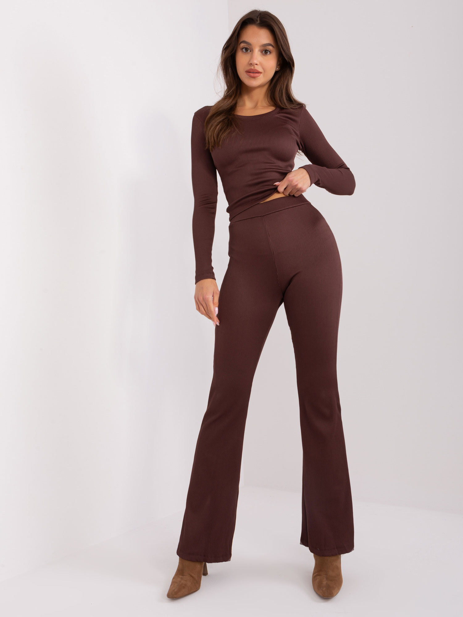 Ciemnobrązowy komplet casualowy ze spodniami dzwonami .