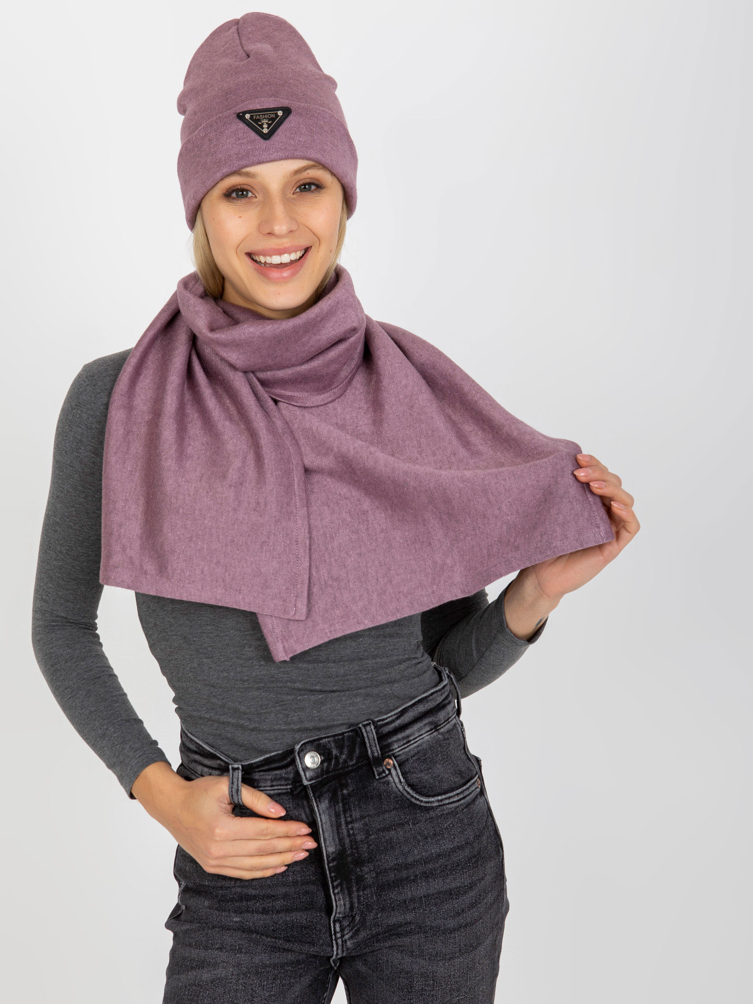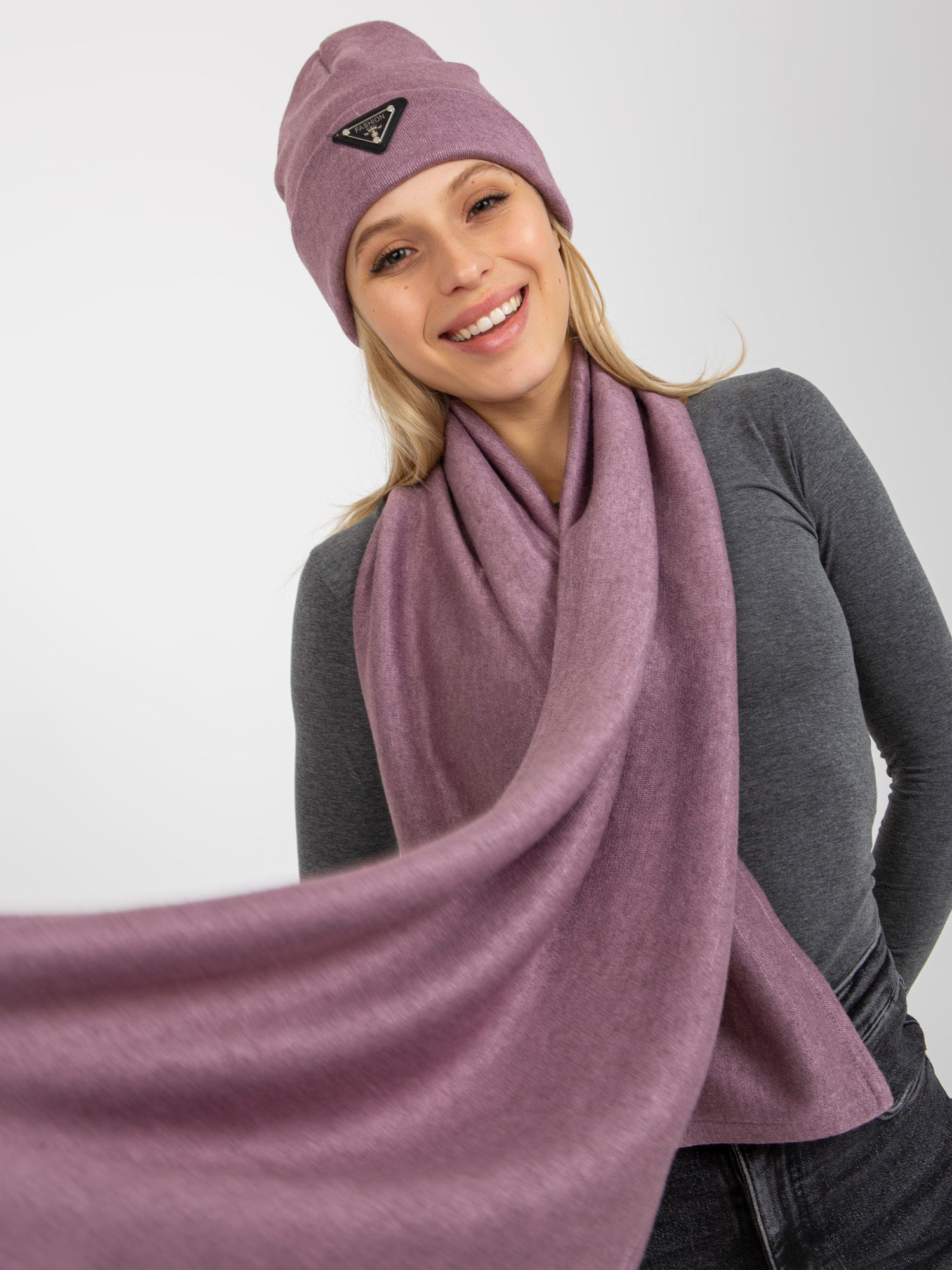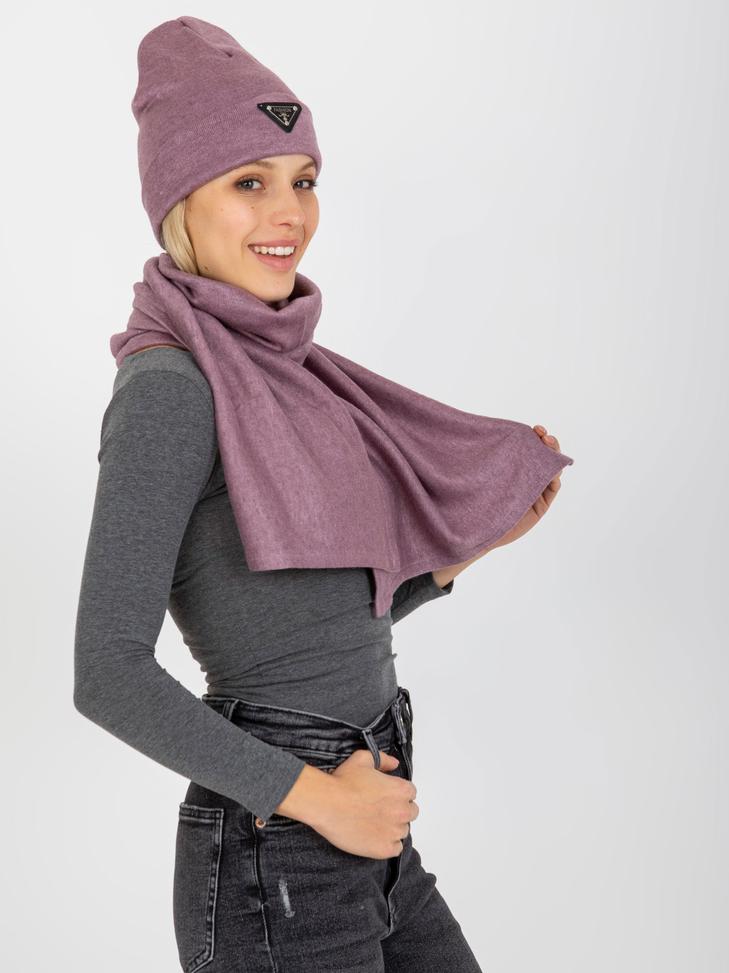 Brudnoróżowy komplet zimowy z szalikiem i czapką .