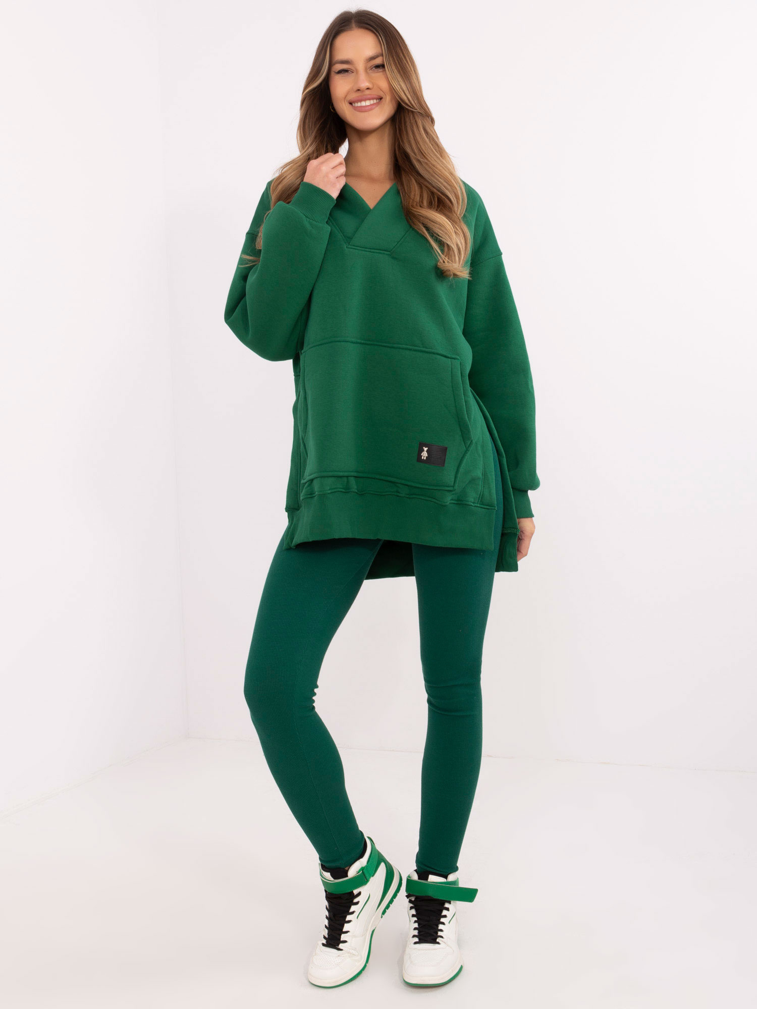 Wymiary bluzy w rozmiarze one size mierzone na płasko: szerokość bluzy pod pachami – 65 cm, długość bluzy – 74 cm (przód), długość bluzy – 83 cm (tył), długość rękawa – 52 cm, obwód w biodrach – 112 cm.