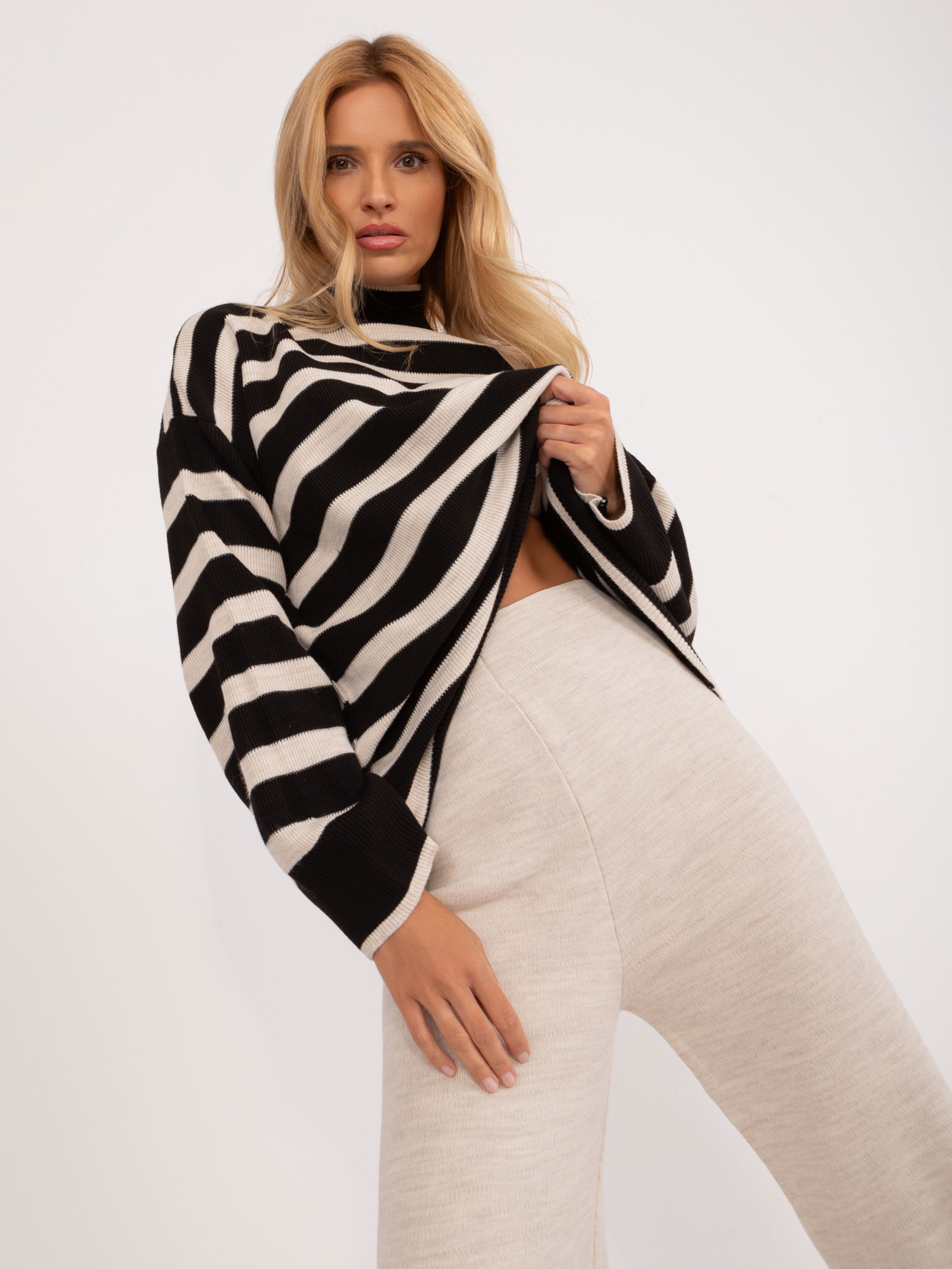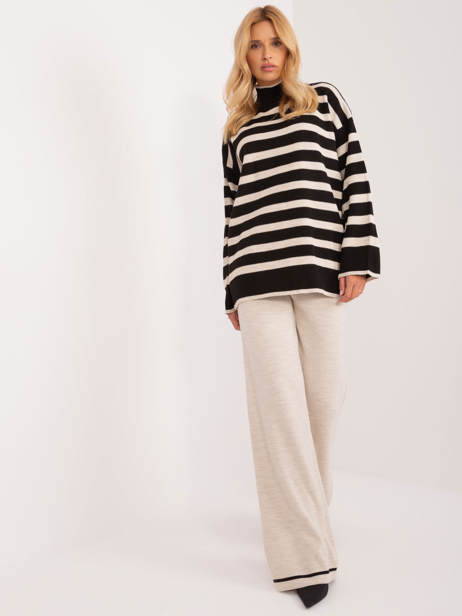 Wymiary kompletu w rozmiarze one size mierzone na płasko: szerokość swetra pod pachami – 63 cm, długość rękawa – 61 cm, długość swetra – 67 cm, szerokość spodni w pasie – 37 cm, wysokość stanu – 37 cm, długość spodni – 114 cm
