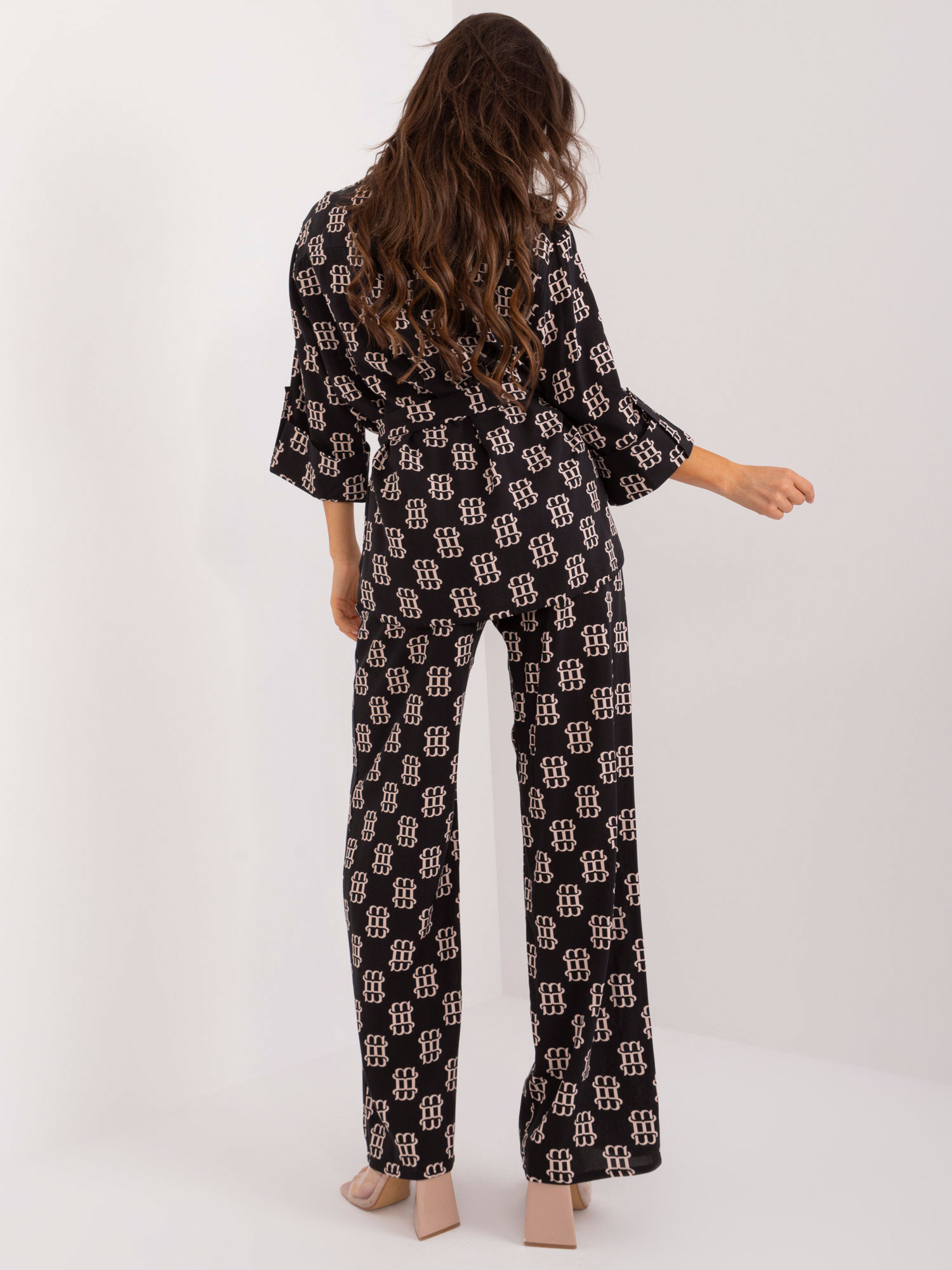Wymiary kompletu w rozmiarze S/M mierzone na płasko: szerokość koszuli pod pachami – 60 cm, długość rękawa – 45 cm, długość koszuli (przód) – 68 cm, długość koszuli (tył) – 77 cm, szerokość spodni w pasie – 34 cm, wysokość stanu – 34 cm, długość spodni – 113 cm.
