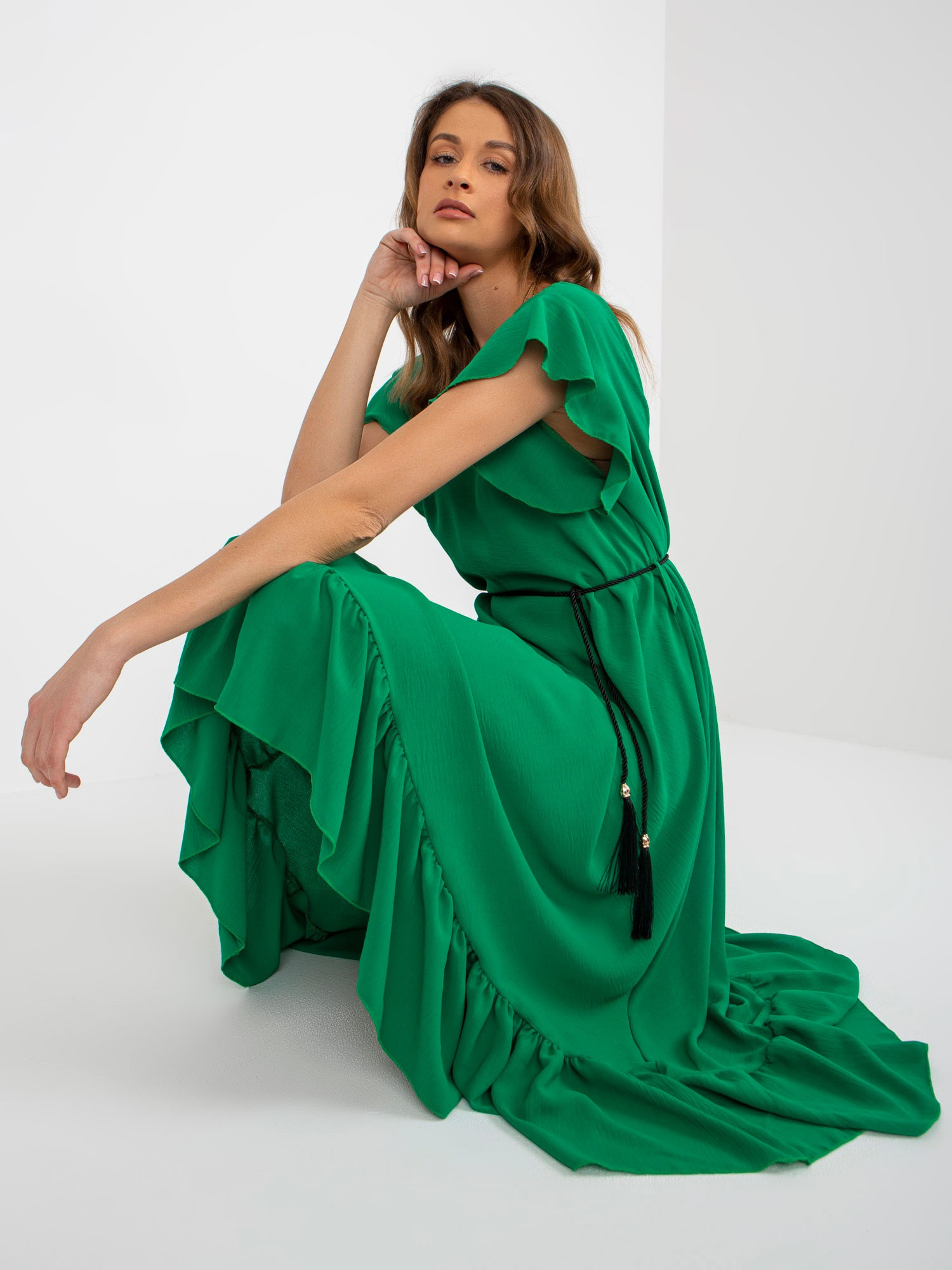 Modelka ma na sobie rozmiar S. Wymiary modelki: wzrost 175 cm, biust 84 cm, talia 65 cm, biodra 92 cm.