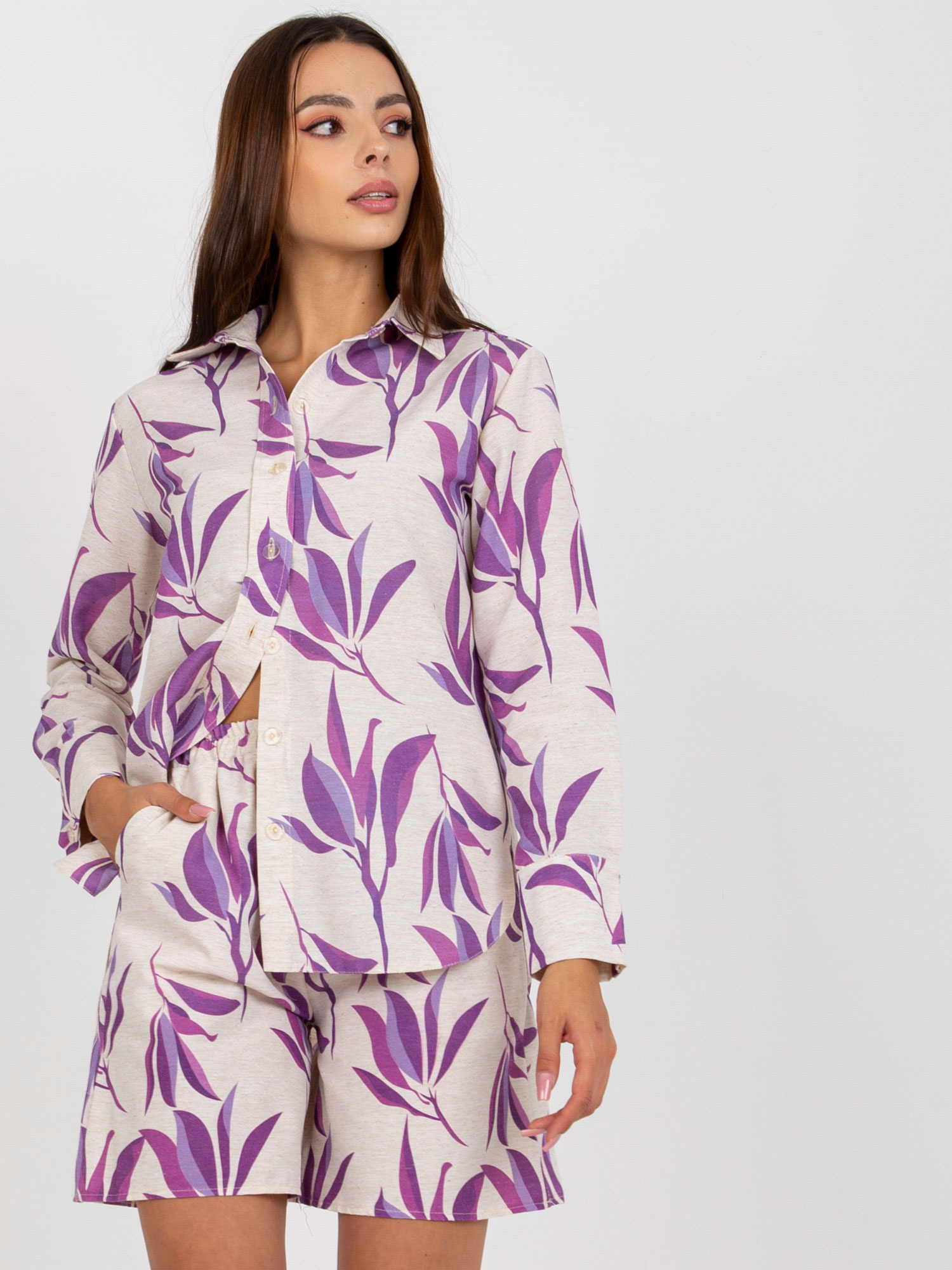 Wymiary kompletu w rozmiarze S/M mierzone na płasko: szerokość koszuli pod pachami – 47 cm, długość rękawa – 56 cm, długość koszuli – 71 cm, szerokość szortów w pasie – 30 cm, wysokość stanu – 30 cm, długość szortów – 45 cm.