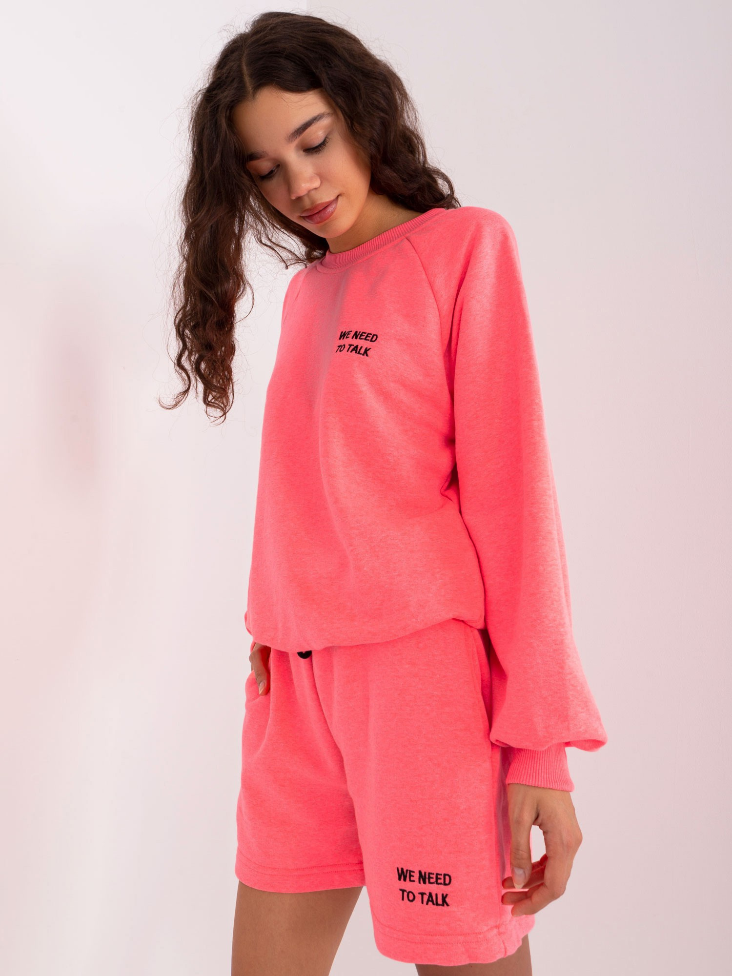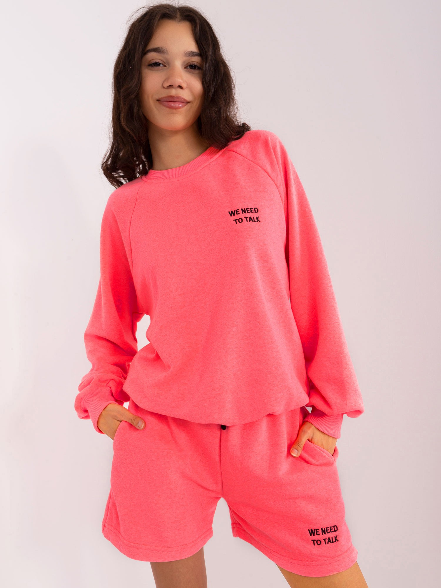 Wymiary kompletu w rozmiarze one size mierzone na płasko: szerokość bluzy pod pachami – 70 cm długość rękawa – 64 cm, długość bluzy – 71 cm, szerokość szortów w pasie – 36 cm, wysokość stanu – 34 cm, długość szortów – 44 cm.