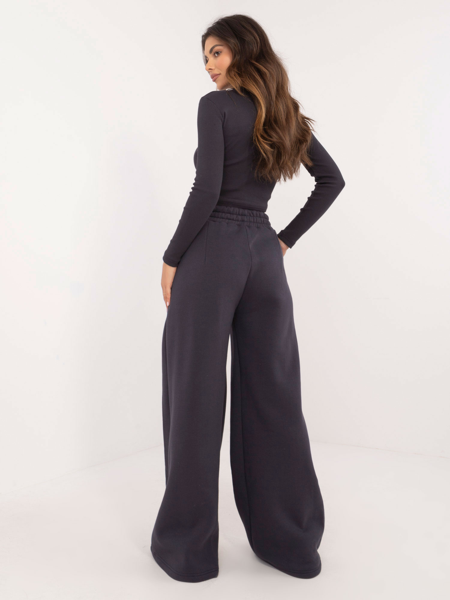 Wymiary kompletu w rozmiarze one size mierzone na płasko: szerokość bluzki pod pachami – 40 cm, długość bluzki – 45 cm, długość rękawa – 55 cm, szerokość spodni w pasie – 34 cm, długość spodni – 115 cm.