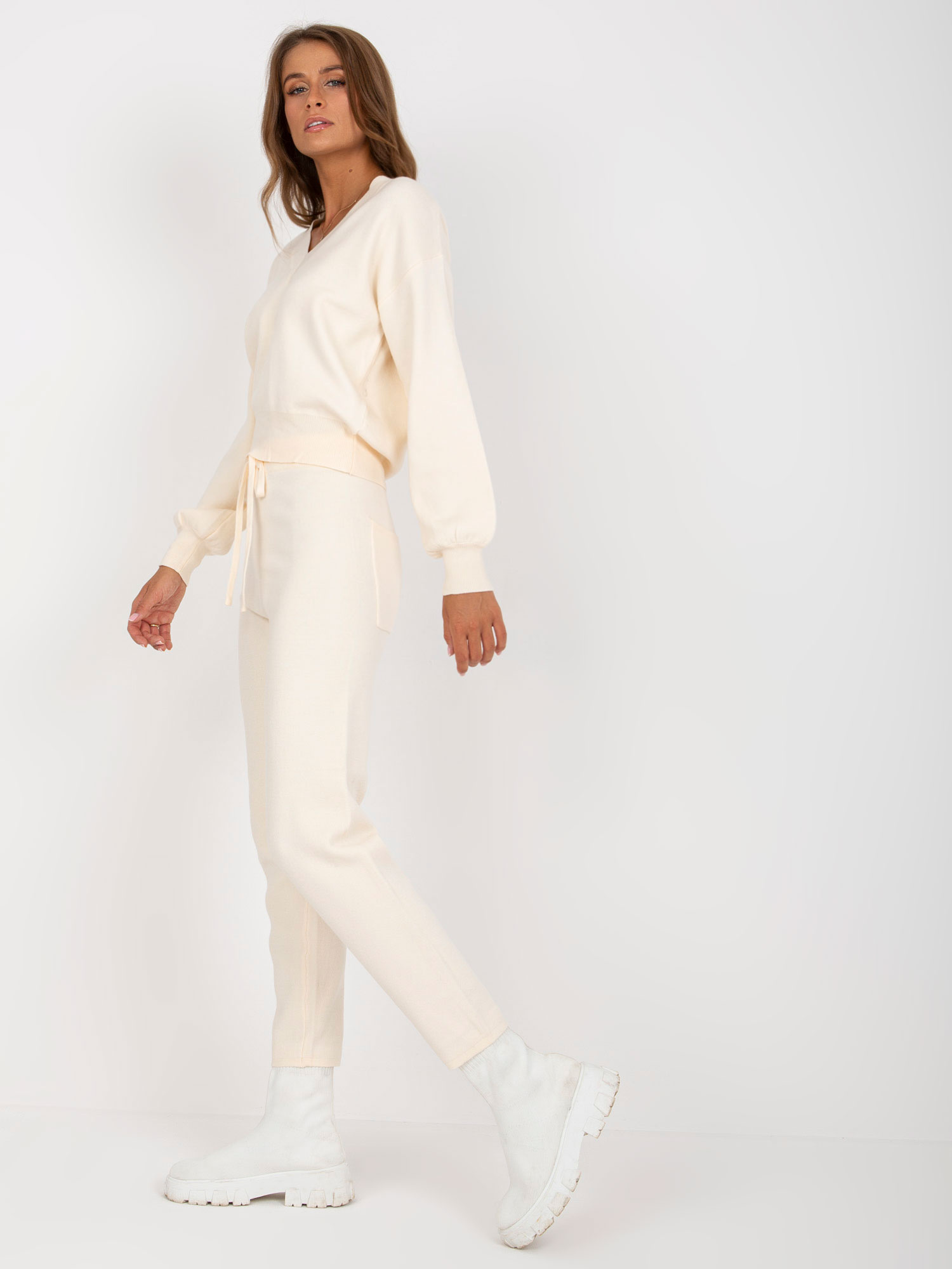 Jasnobeżowy komplet casualowy ze spodniami.