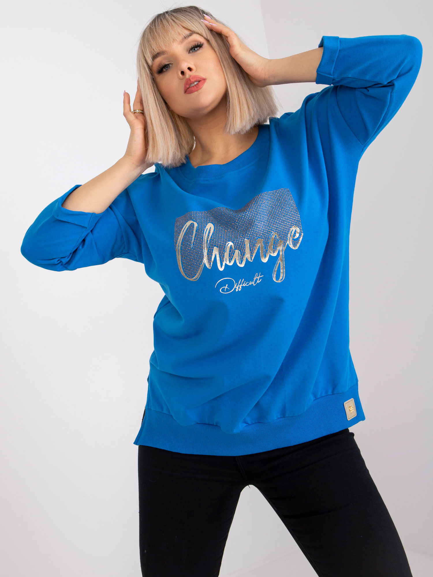 Wymiary kompletu w rozmiarze one size mierzone na płasko: szerokość bluzy pod pachami – 60 cm, długość bluzy – 81 cm, długość rękawa – 60 cm, szerokość topu pod pachami – 38 cm, długość topu – 42 cm, szerokość spodni w pasie – 34 cm, długość spodni – 96 cm.