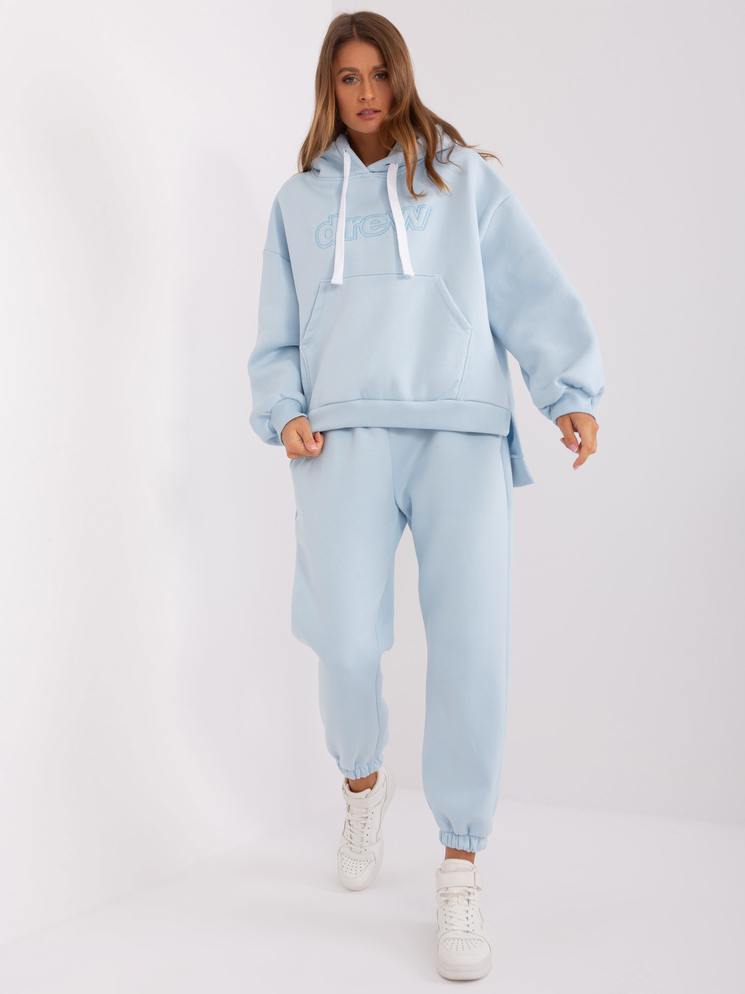 Jasnoniebieski komplet dresowy z bluzą kangurką.