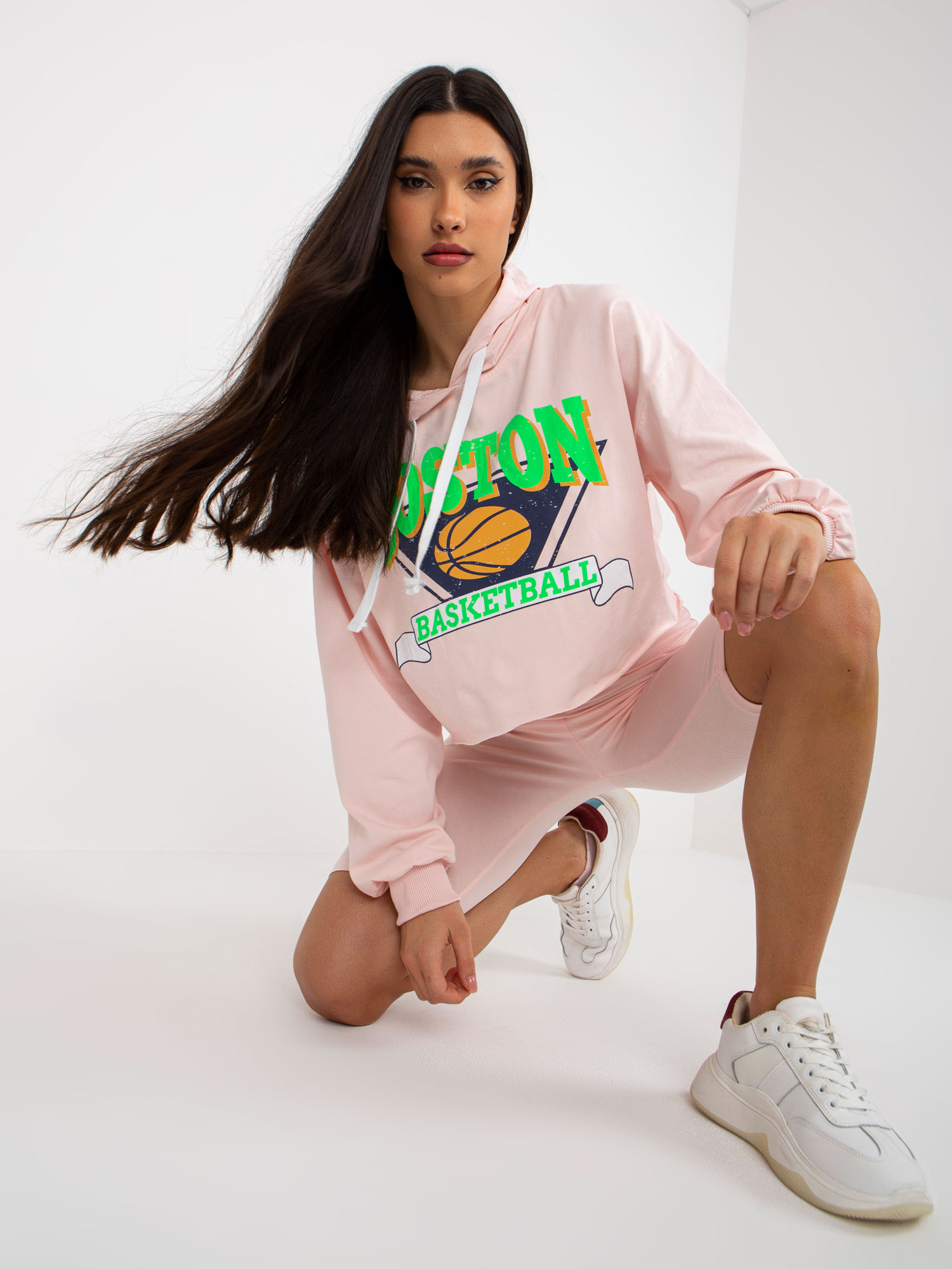 Jasnoróżowy komplet casualowy z bluzą i kolarkami .