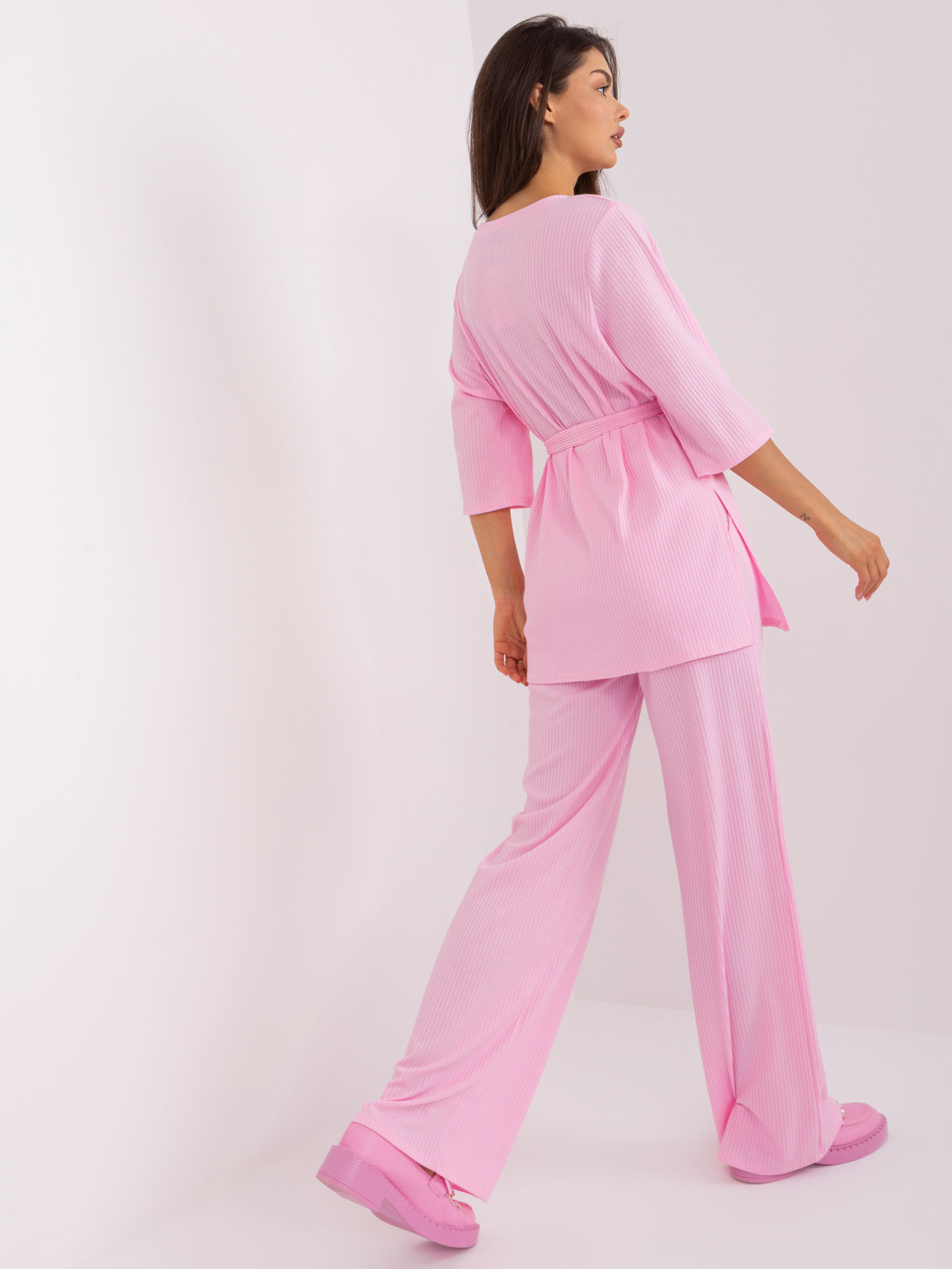Jasnoróżowy damski komplet casualowy ze spodniami .