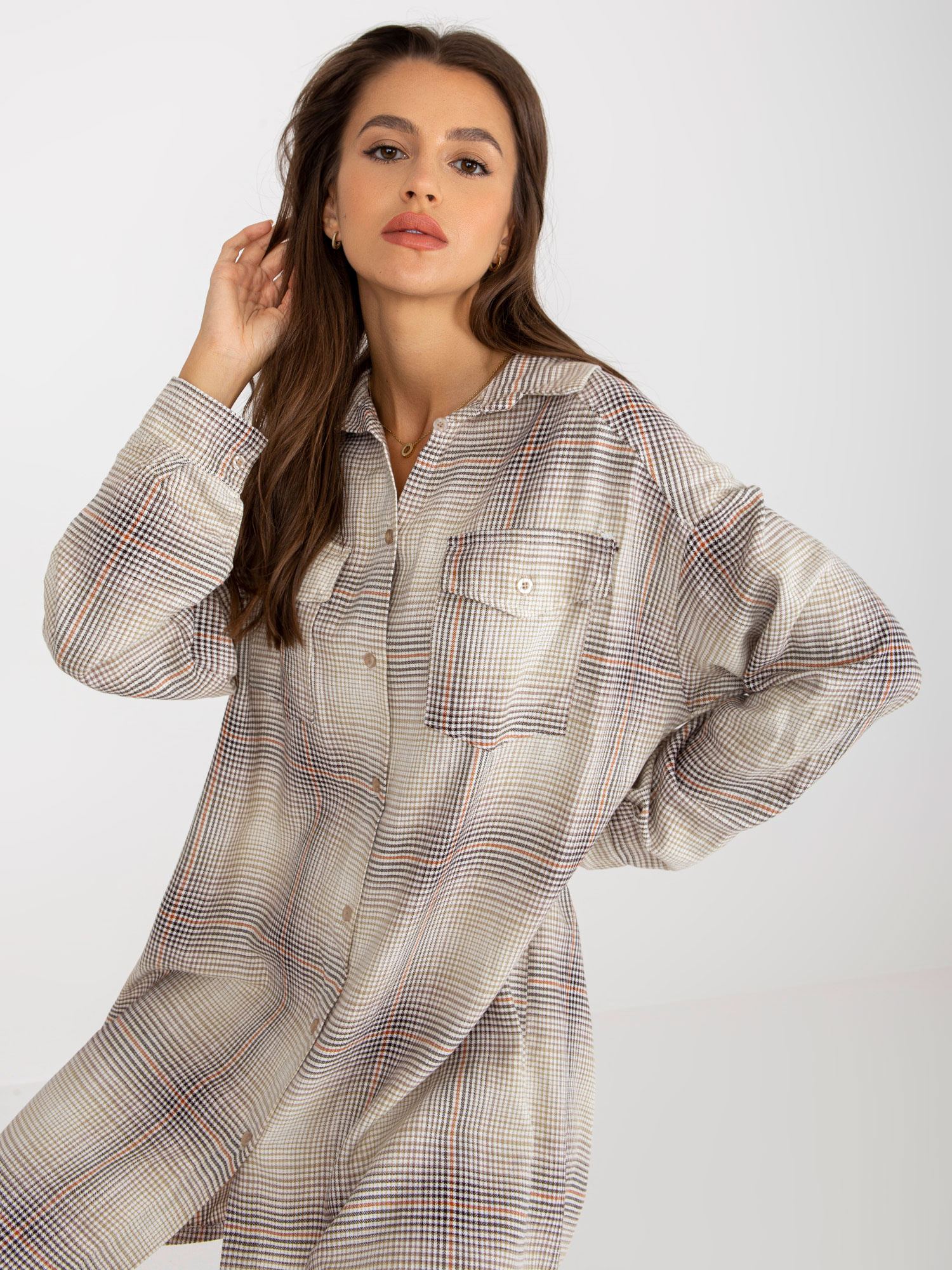 Modelka ma na sobie rozmiar one size. Wymiary modelki: wzrost 173 cm, biust 89 cm, talia 65 cm, biodra 91 cm.