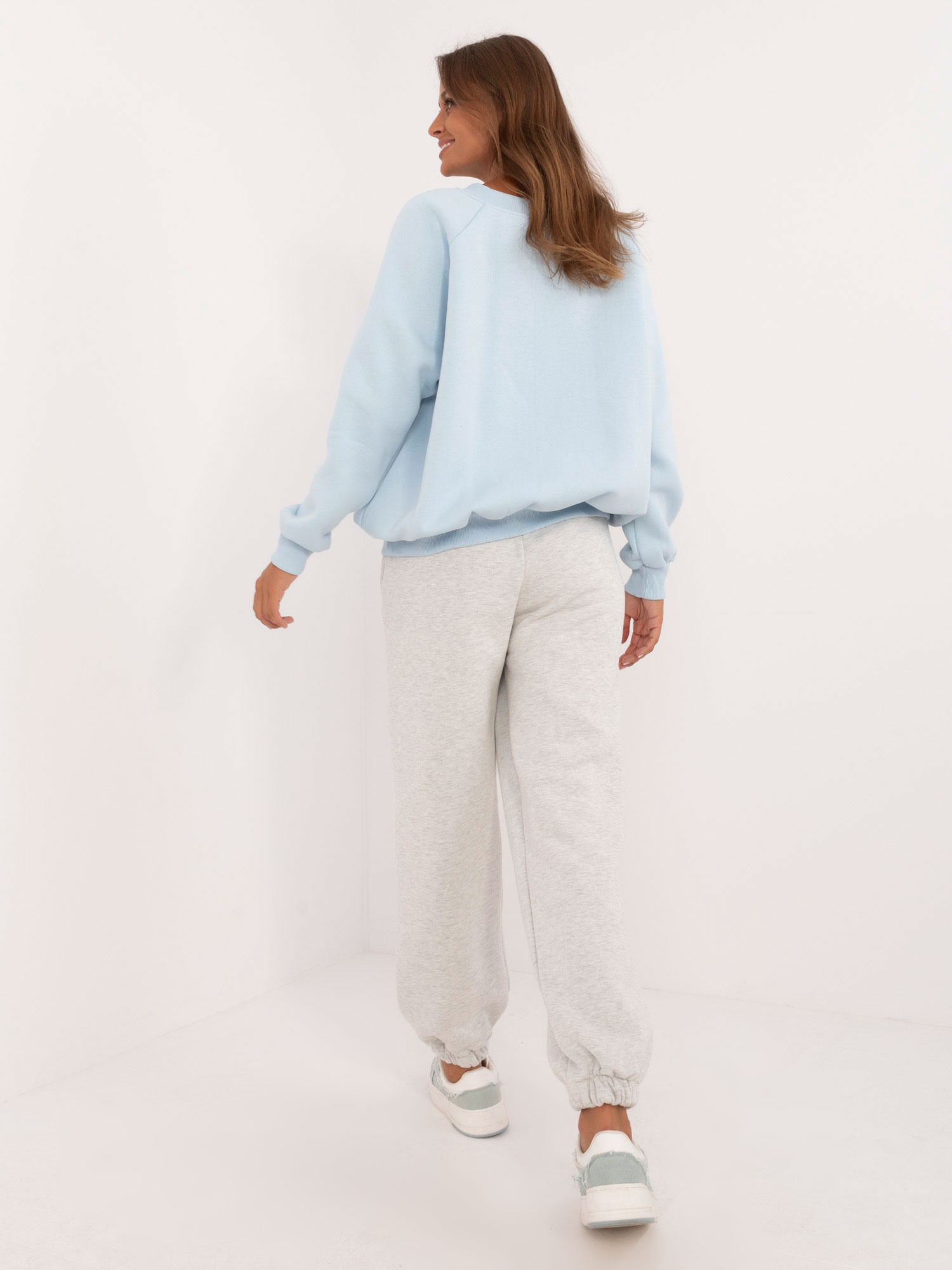 Wymiary kompletu w rozmiarze one size mierzone na płasko: szerokość bluzy pod pachami – 72 cm, długość bluzy – 62 cm, długość rękawa – 64 cm, szerokość spodni w pasie – 33 cm, wysokość stanu – 37 cm, długość spodni – 107 cm.
