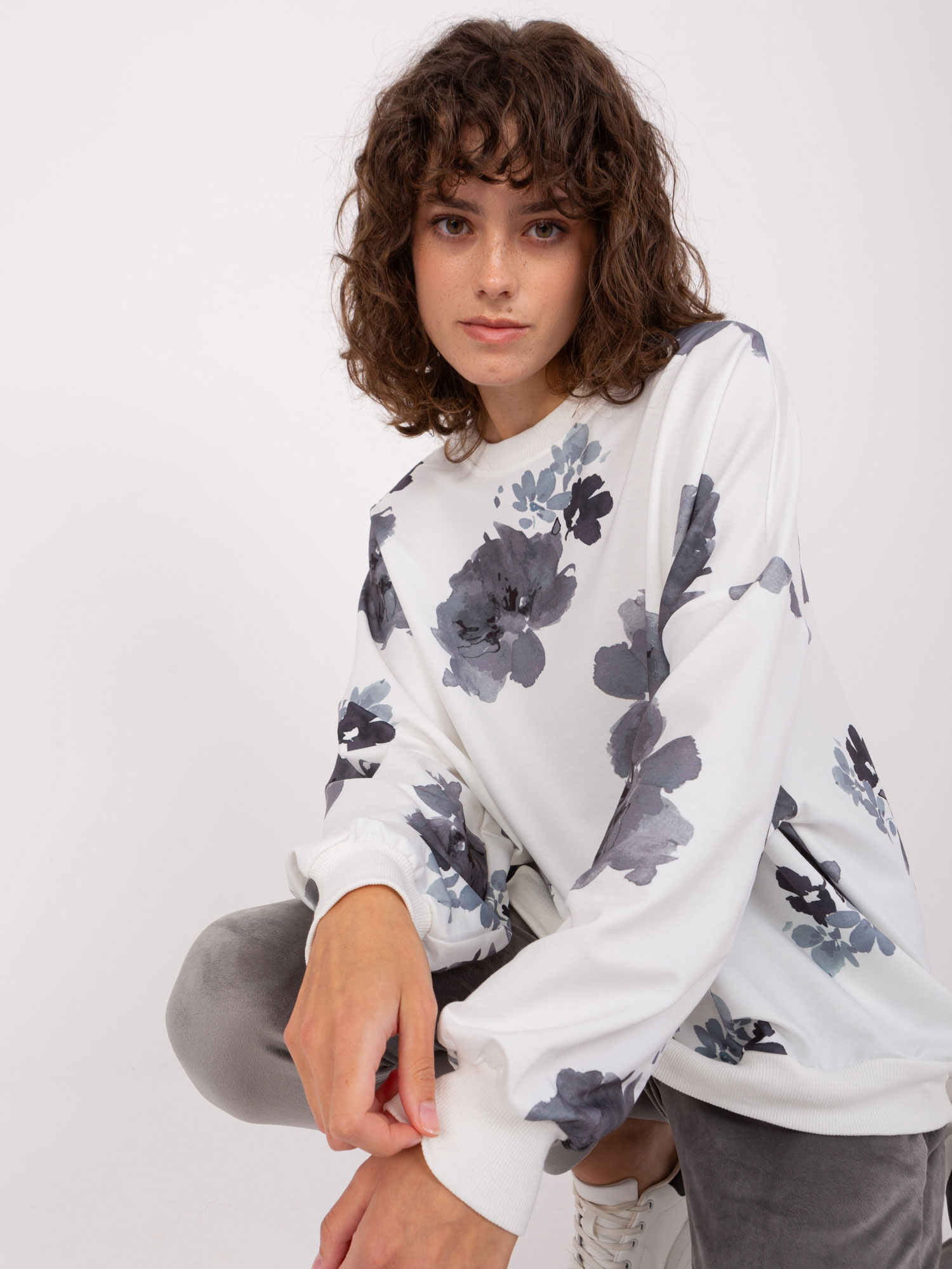 Ecru-szary komplet damski z motywem kwiatowym.