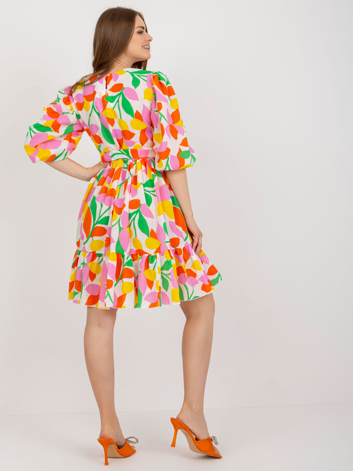 Modelka ma na sobie rozmiar S. Wymiary modelki: wzrost 173 cm, biust 81 cm, talia 60 cm, biodra 90 cm.