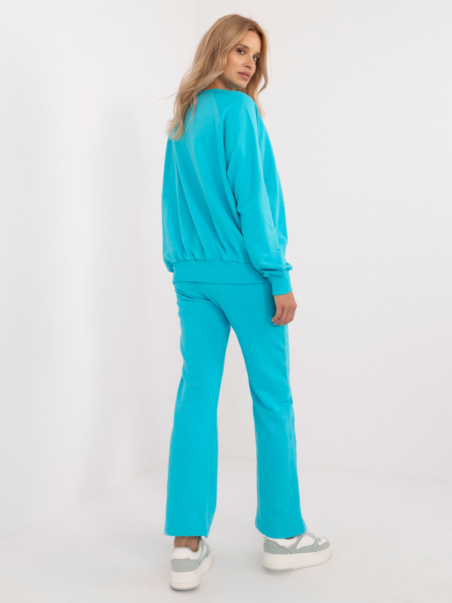 Wymiary kompletu w rozmiarze one size mierzone na płasko: szerokość bluzy pod pachami – 68 cm, długość bluzy – 67 cm, długość rękawa – 64 cm, szerokość spodni w pasie – 33 cm, wysokość stanu – 34 cm, długość spodni – 105 cm.