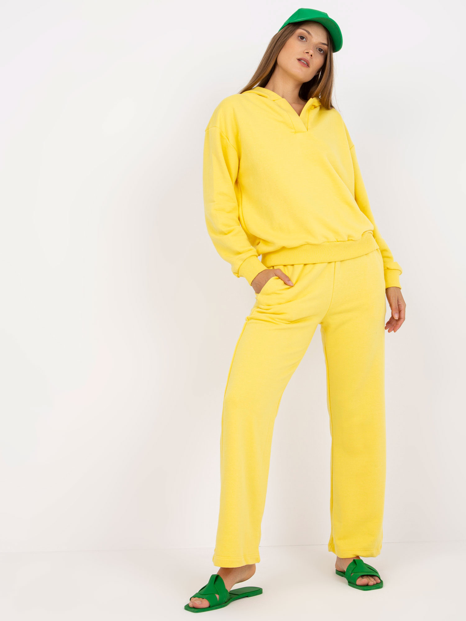 Wymiary kompletu w rozmiarze S/M mierzone na płasko: szerokość bluzy pod pachami – 55 cm, długość rękawa – 54 cm, długość bluzy- 59 cm, szerokość spodni w pasie – 35 cm, wysokość stanu – 34 cm, długość spodni – 103 cm.
