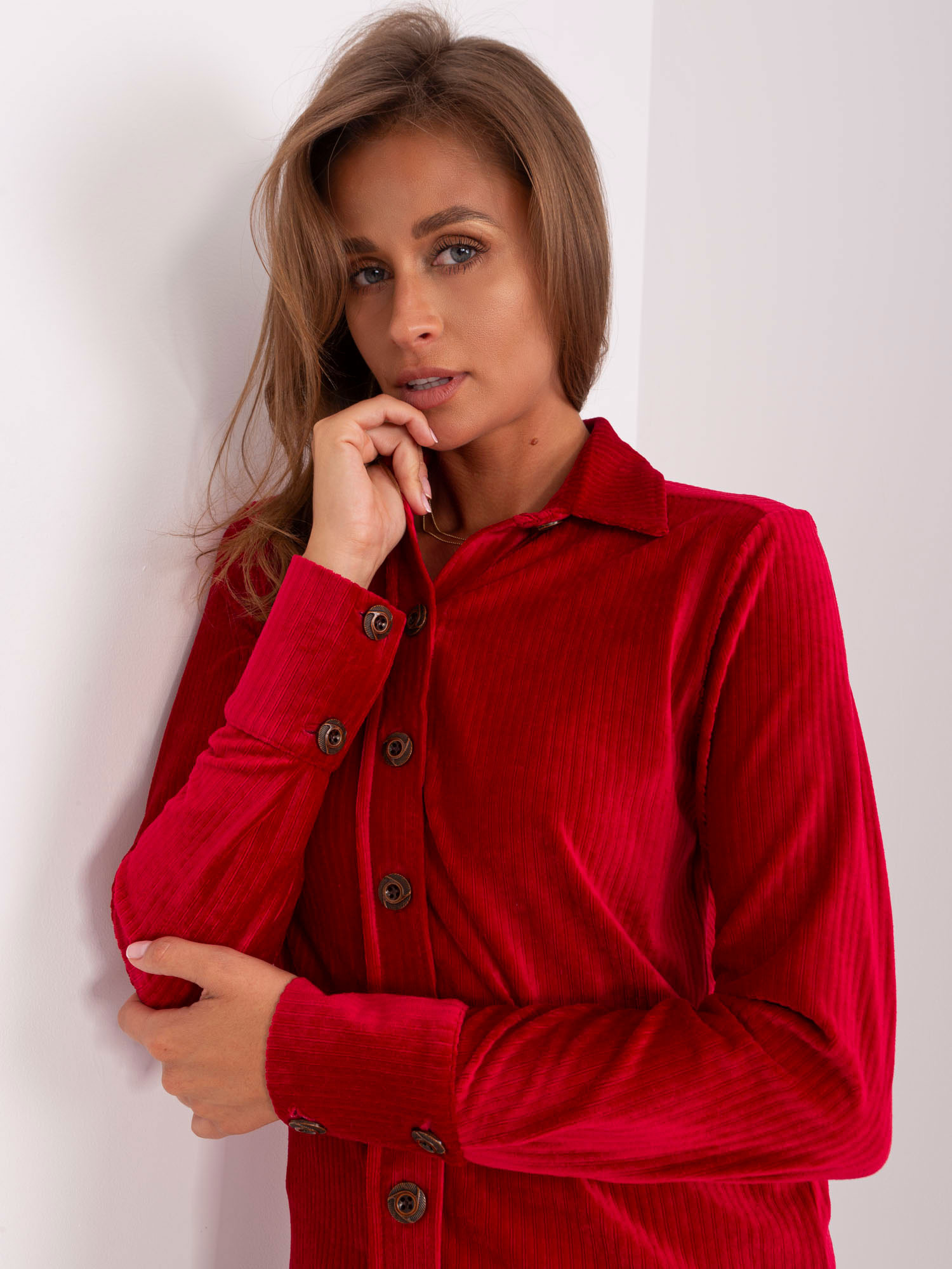 Bordowa sztruksowa koszula z guzikami .