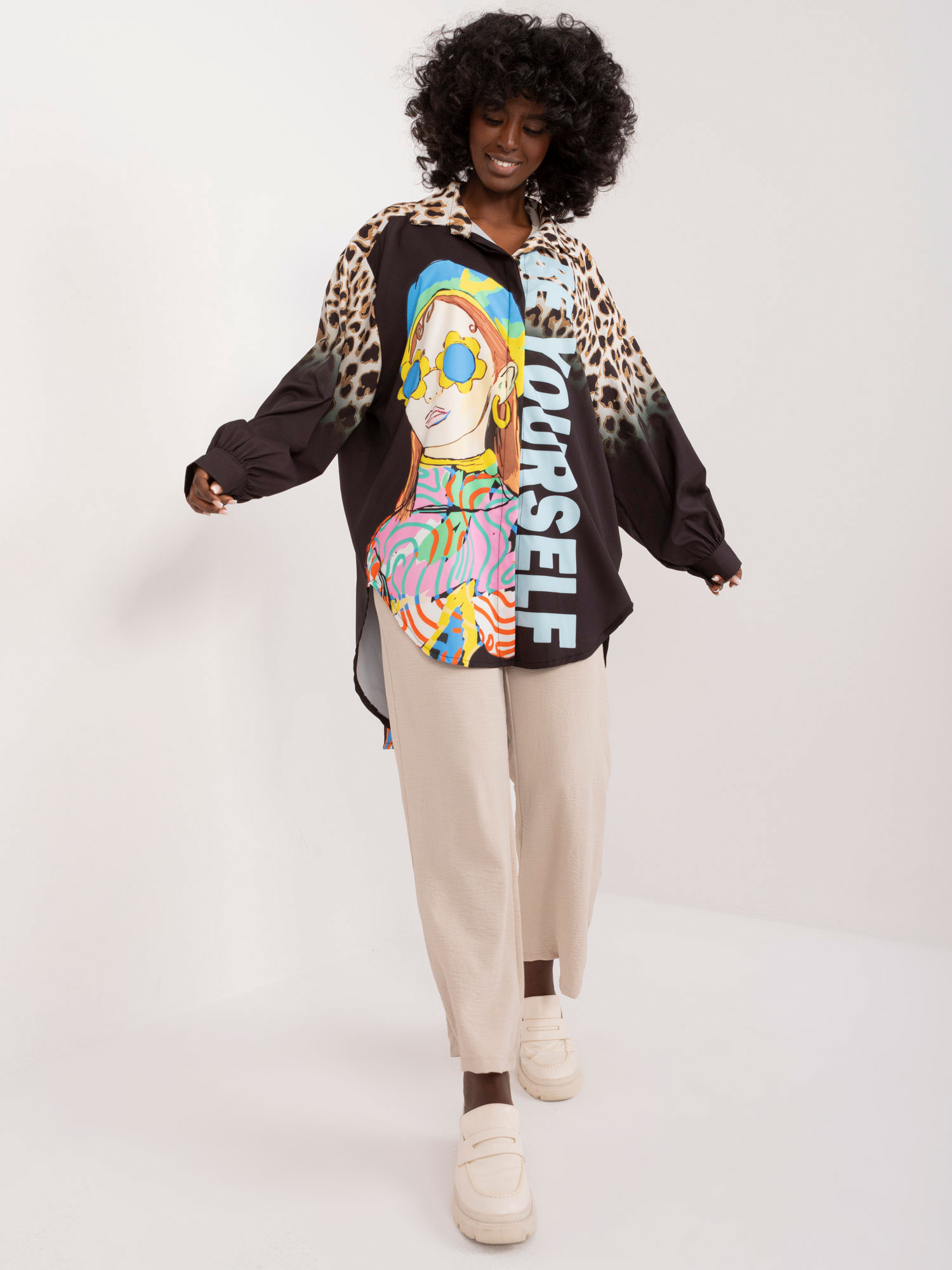 Wymiary koszuli w rozmiarze one size mierzone na płasko: szerokość pod pachami – 70 cm, długość rękawa – 61 cm, długość całkowita (przód) – 75 cm, długość całkowita (tył) – 94 cm .
