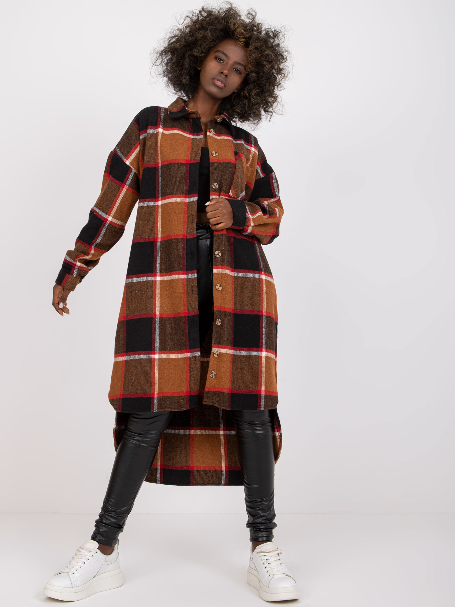 Wymiary koszuli w rozmiarze one size mierzone na płasko: szerokość pod pachami – 58 cm, długość całkowita (przód) – 94 cm, długość całkowita (tył) – 112, długość rękawa – 62 cm.