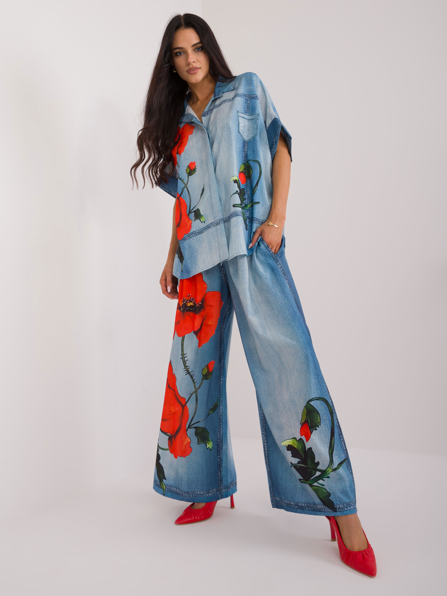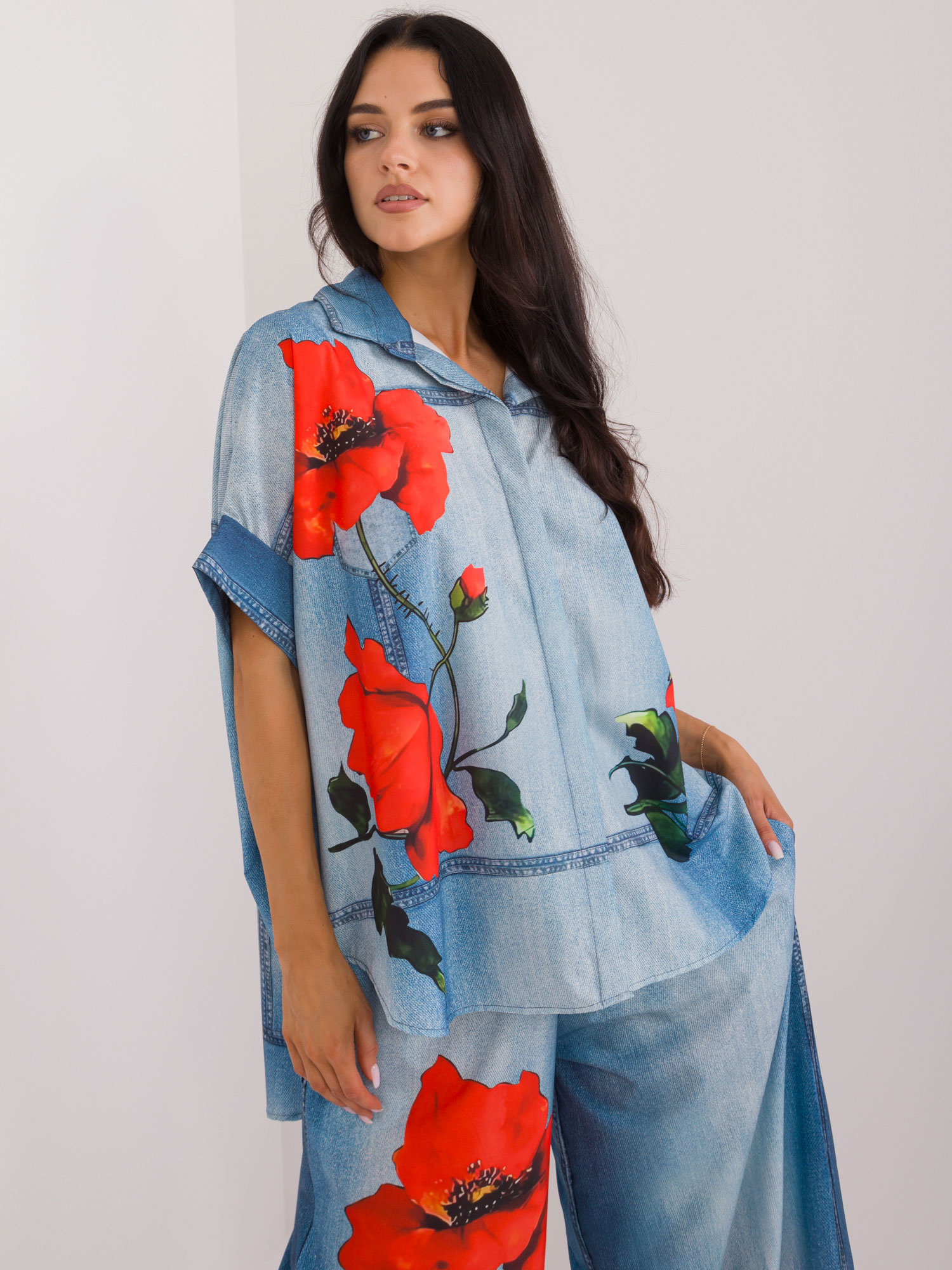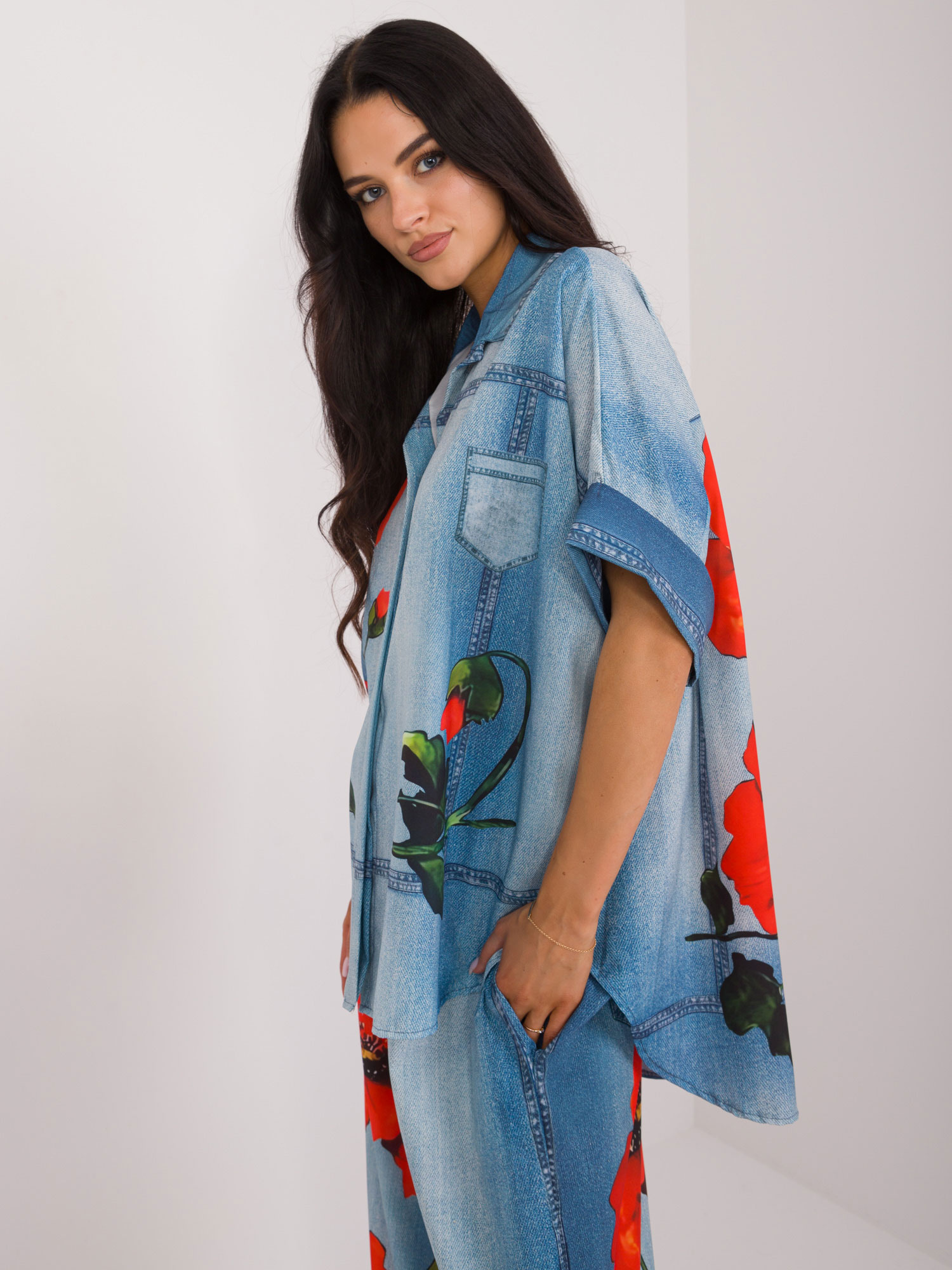 Wymiary koszuli w rozmiarze one size mierzone na płasko: szerokość pod pachami – 82 cm, długość całkowita (przód) – 65 cm, długość całkowita (tył) – 77 cm .