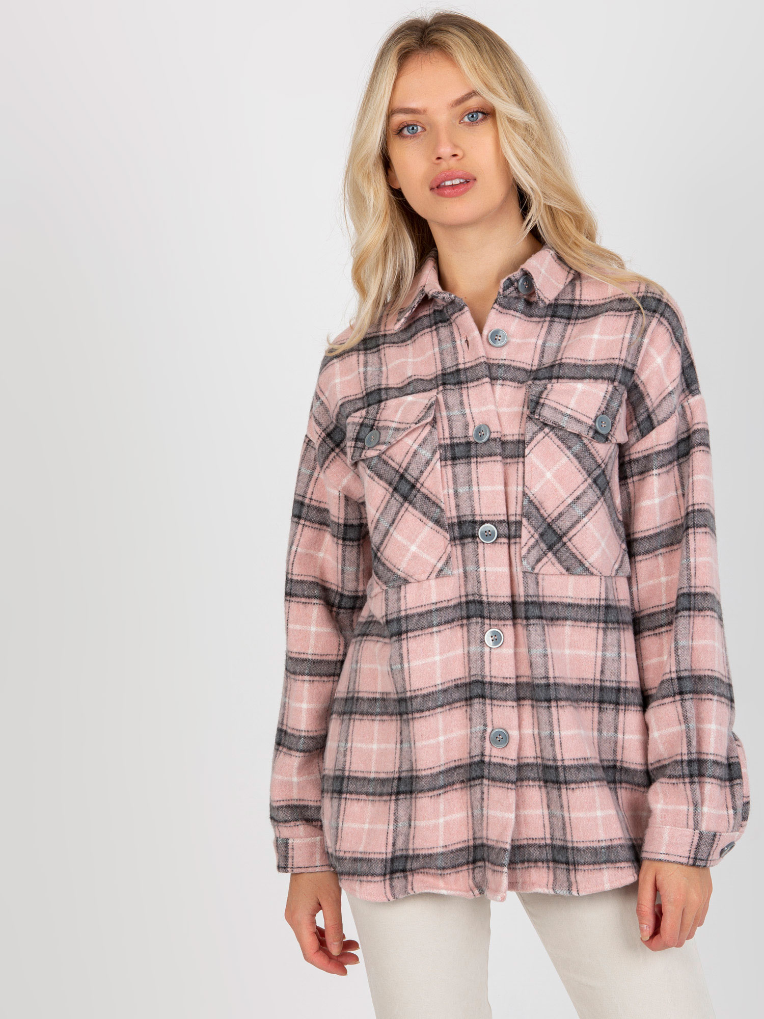 Różowa wierzchnia koszula w kratę z kieszeniami .